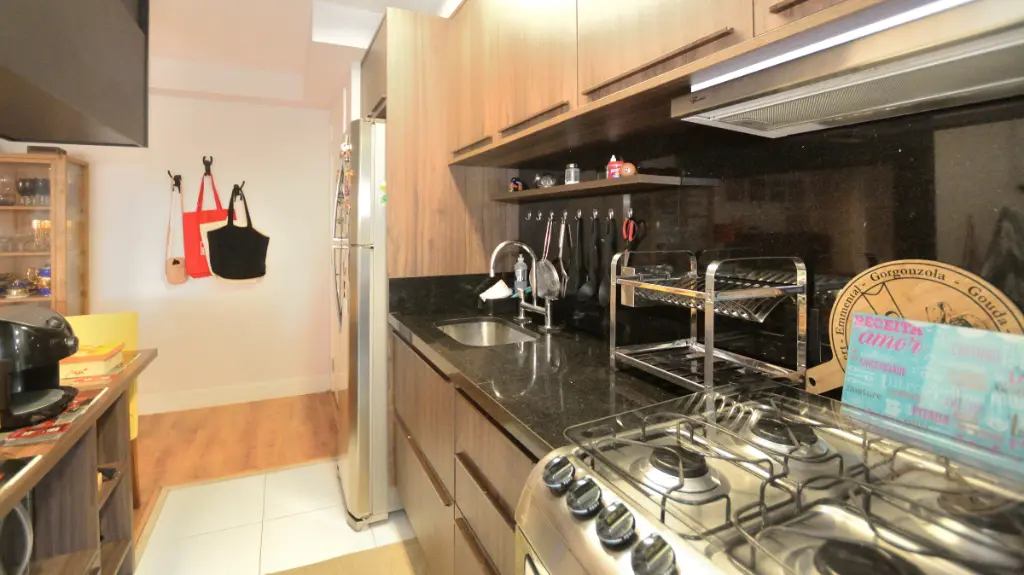 4) Banheiro principal com acabamentos em pastilhas e bancada em granito preto absoluto.Este é o imóvel ideal para solteiros, casais ou investidores que buscam um produto diferenciado e pronto para morar.