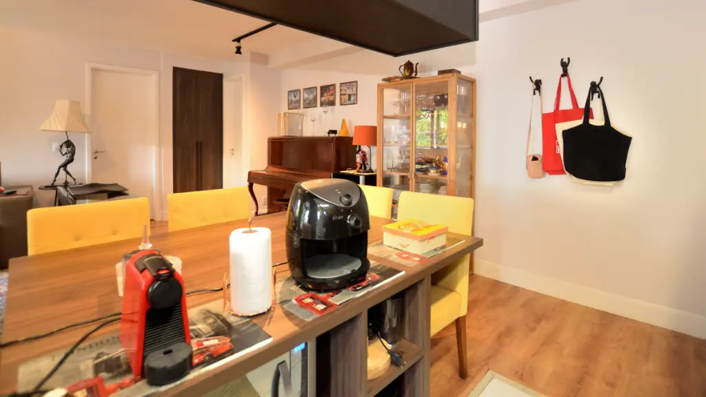 - Cozinha de Chef Integrada: Esqueça paredes isoladas. Aqui a cozinha com armários planejados premium em tons escuros se funde à sala de jantar, permitindo que você cozinhe enquanto interage com seus convidados.