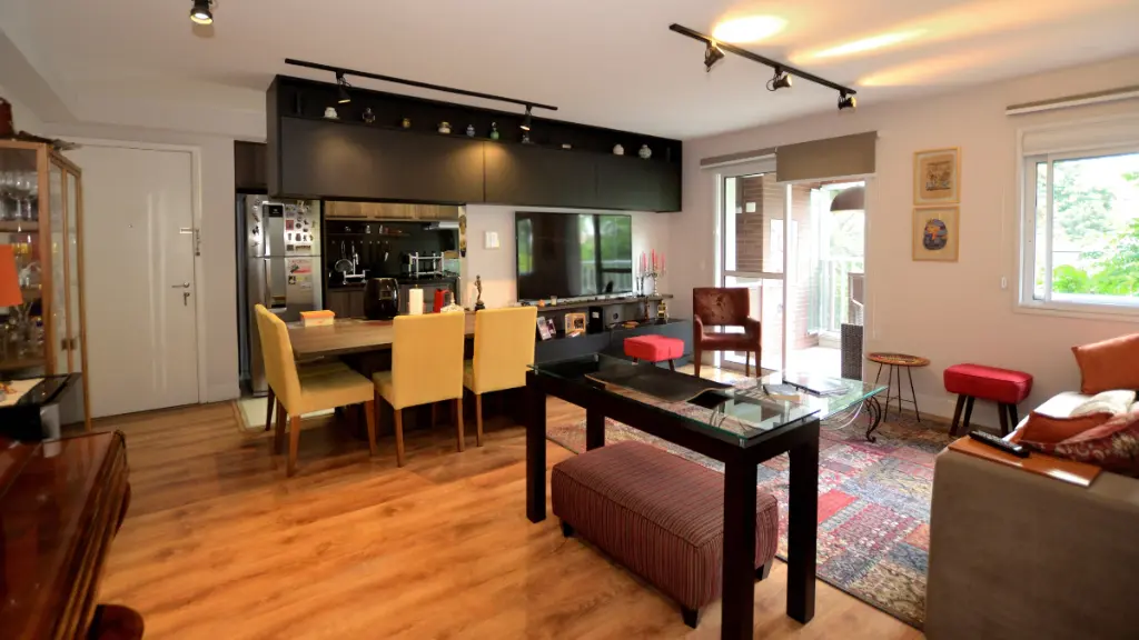 - Living Extenso e Versátil: Atualmente com uma sala de estar ampliada que exala sofisticação, o espaço é banhado por iluminação natural e conta com um projeto luminotécnico em trilhos pretos que dá um ar industrial chic ao ambiente.