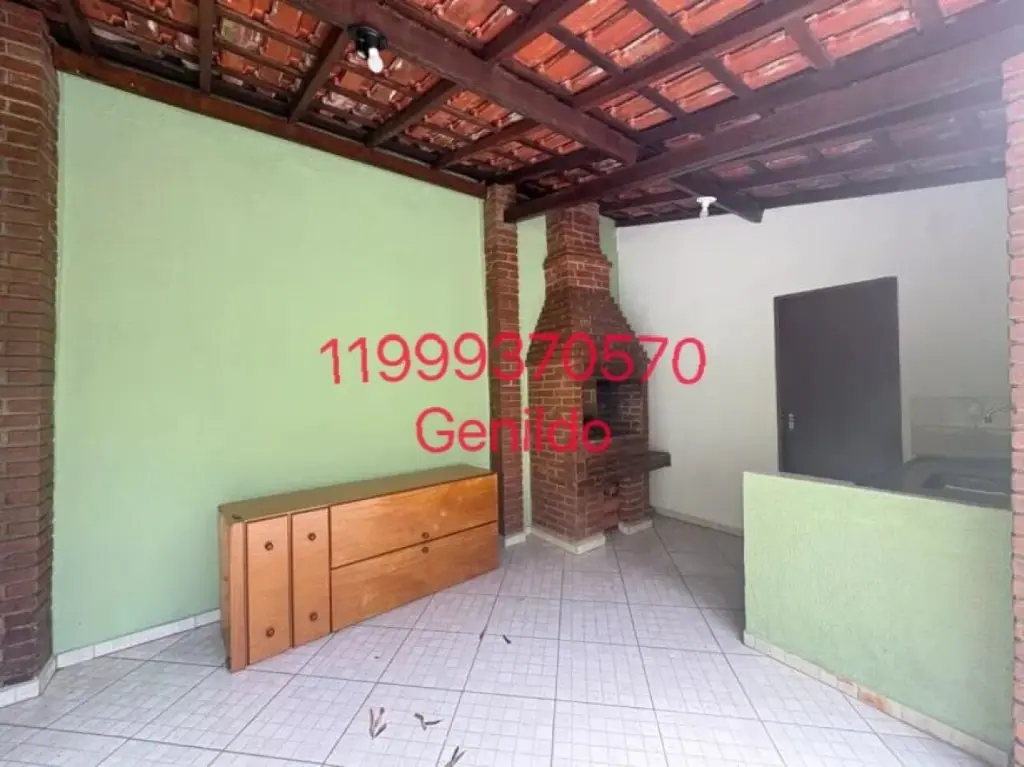 Casa térrea com 2 quartos, 1 banheiro, área de serviço, corredor lateral, 2 vagas cobertas, quintal com churrasqueira e edícula com banheiro.