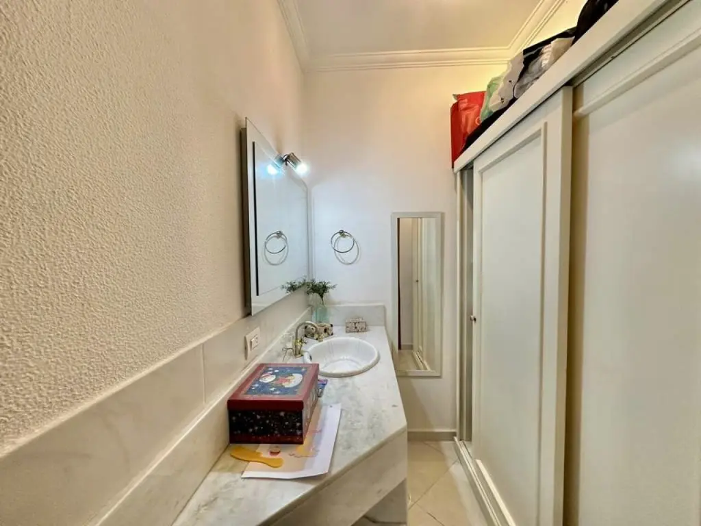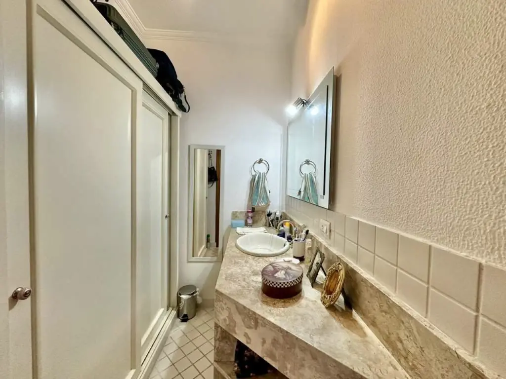 Banheiros com tampos em mármore Travertino, espelhos, gabinetes, box de vidro, sendo a master com 2 cubas e lavatório externo.