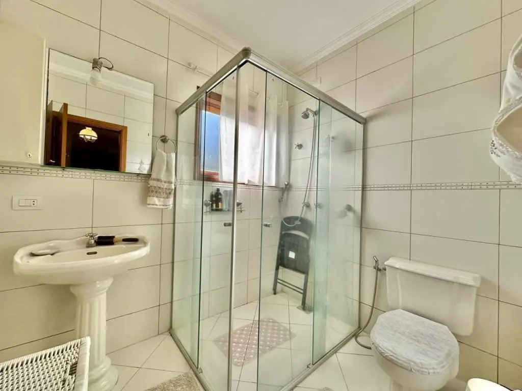 Dependências de serviço: quarto com ventilador de teto e banheiro com box de vidro e chuveiro elétrico.
