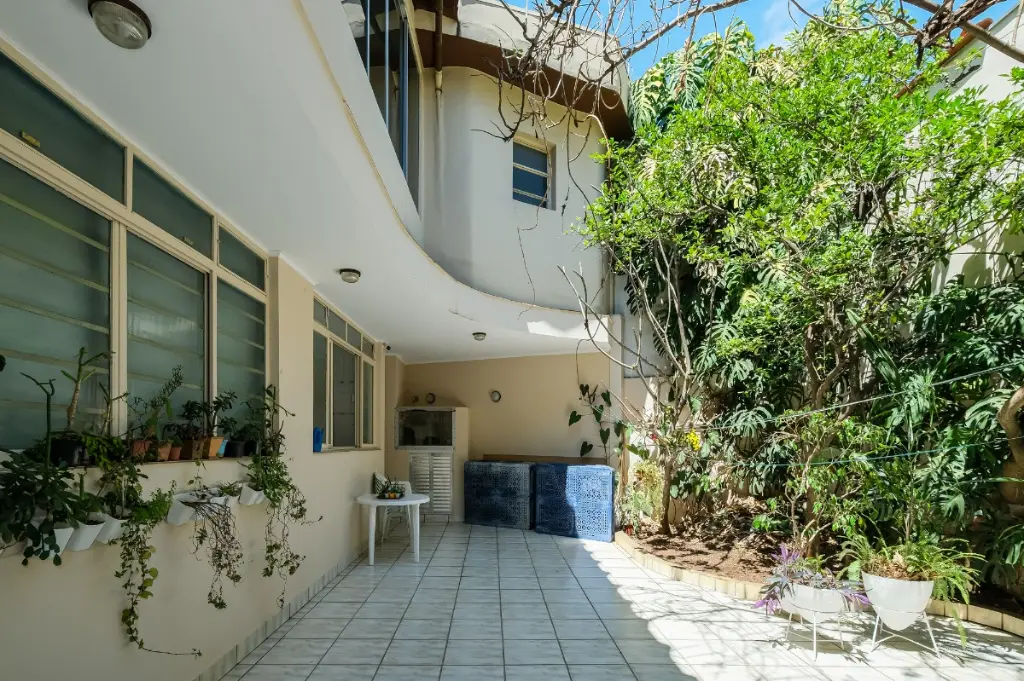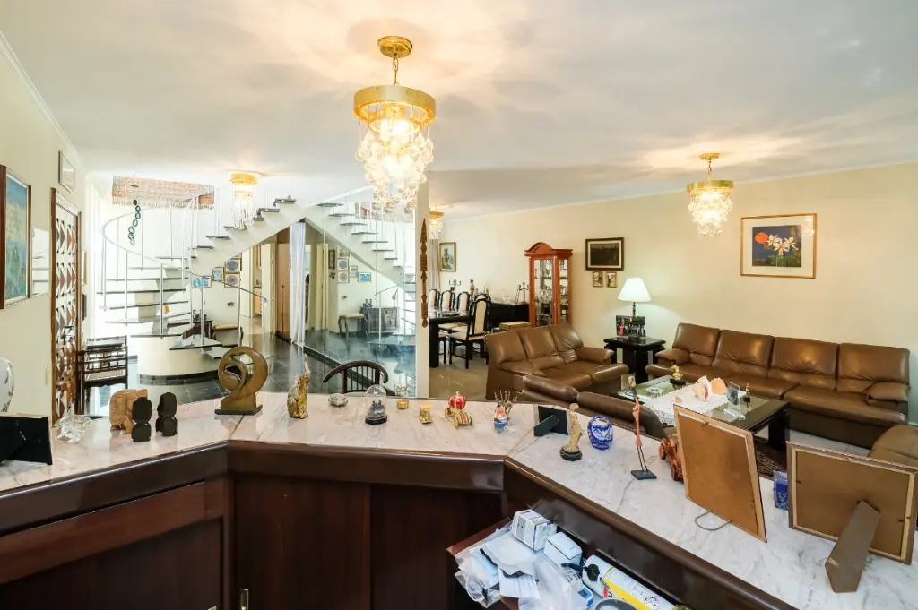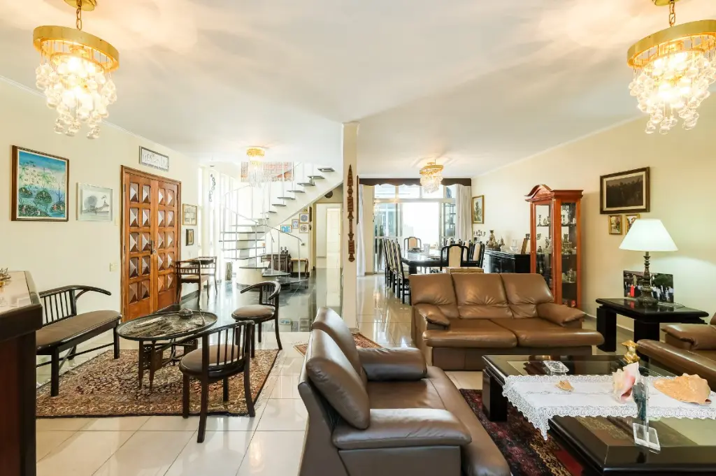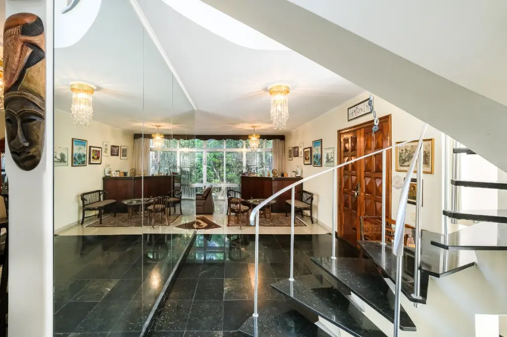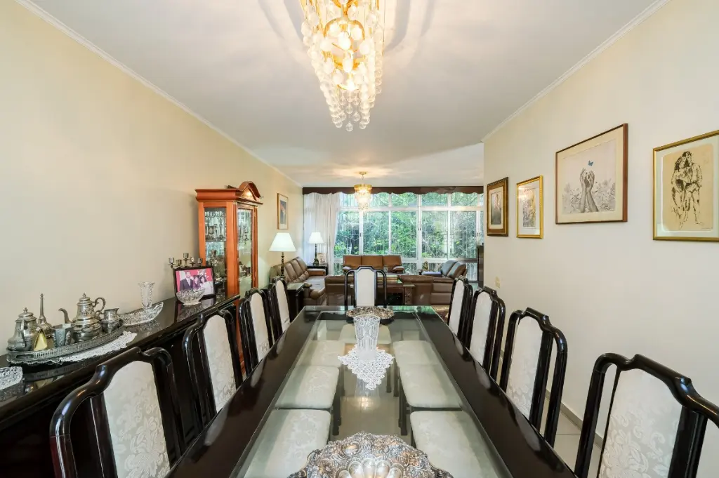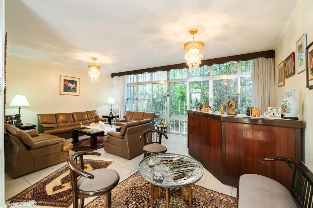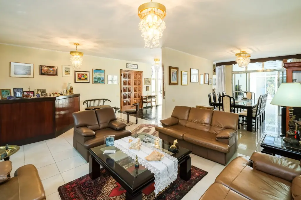 Ampla sala, lavabo, copa, cozinha, escritório, lavanderia, banheiro de serviço e jardim de inverno de 21 m² (além da área construída) com cobertura de vidro climatizado