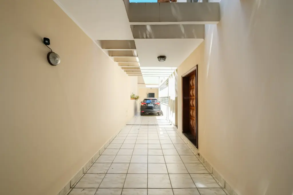 Garagem para 4 automóveis, quintal com jardim nos fundos e jardim na frente