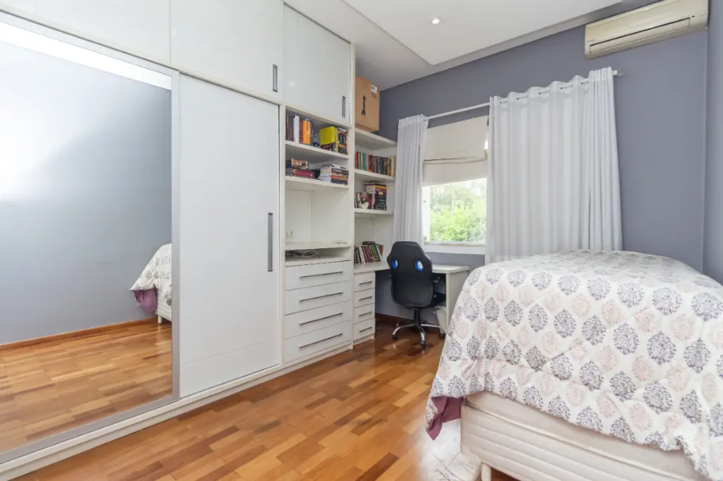 No andar superior, 3 suítes confortáveis, suíte do casal com varanda, closet e jacuzzi, todas com armários e ar-condicionado.