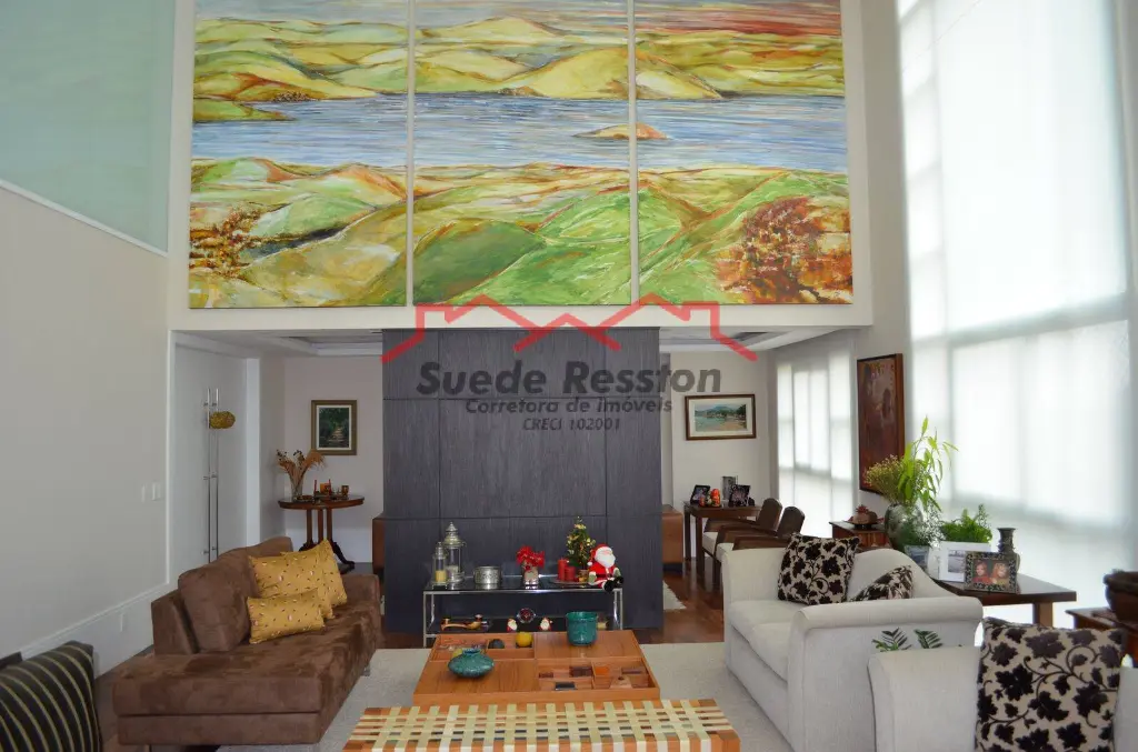A área social é um dos grandes destaques: uma sala ampla e bem distribuída, com lareira, perfeita para momentos de convivência e recepção de convidados. O pé-direito alto valoriza ainda mais o espaço, garantindo abundante iluminação natural e ótima ventilação, além de uma agradável sensação de amplitude.