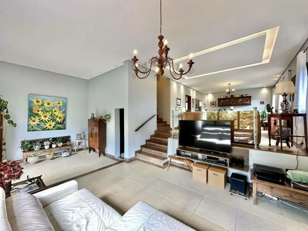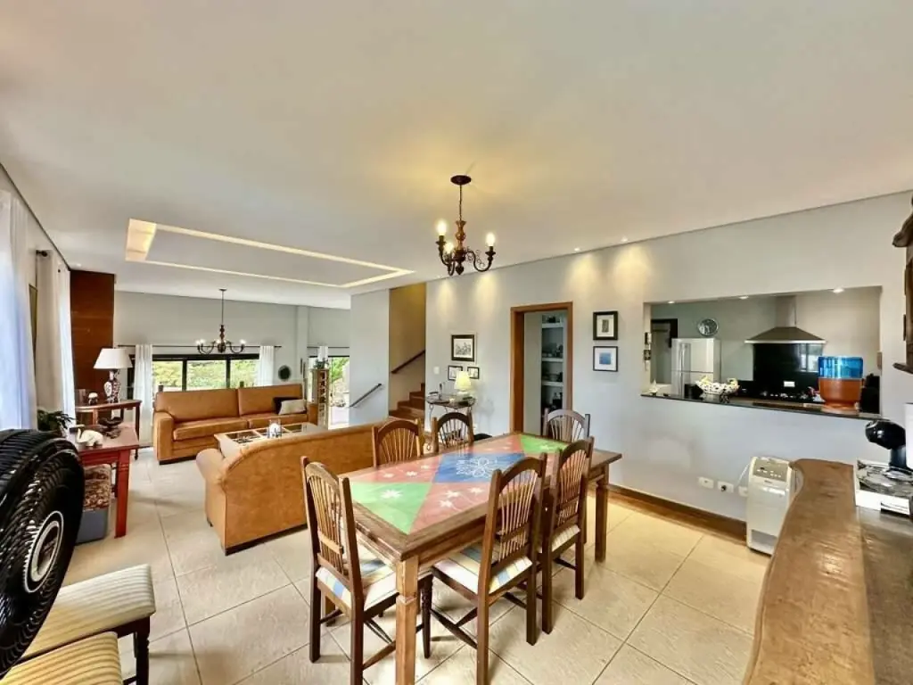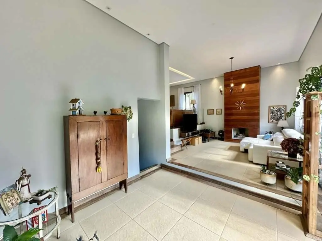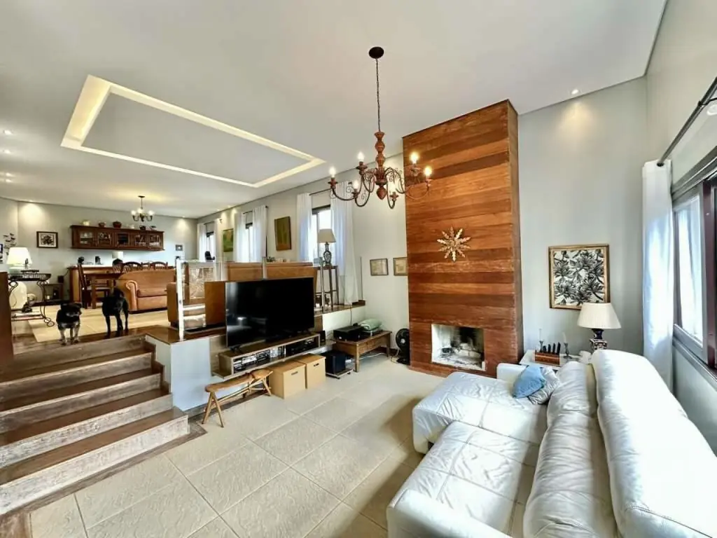 Espaços sociais integrados com 4 ambientes em desnível: salas de jantar, estar, estar com lareira, TV