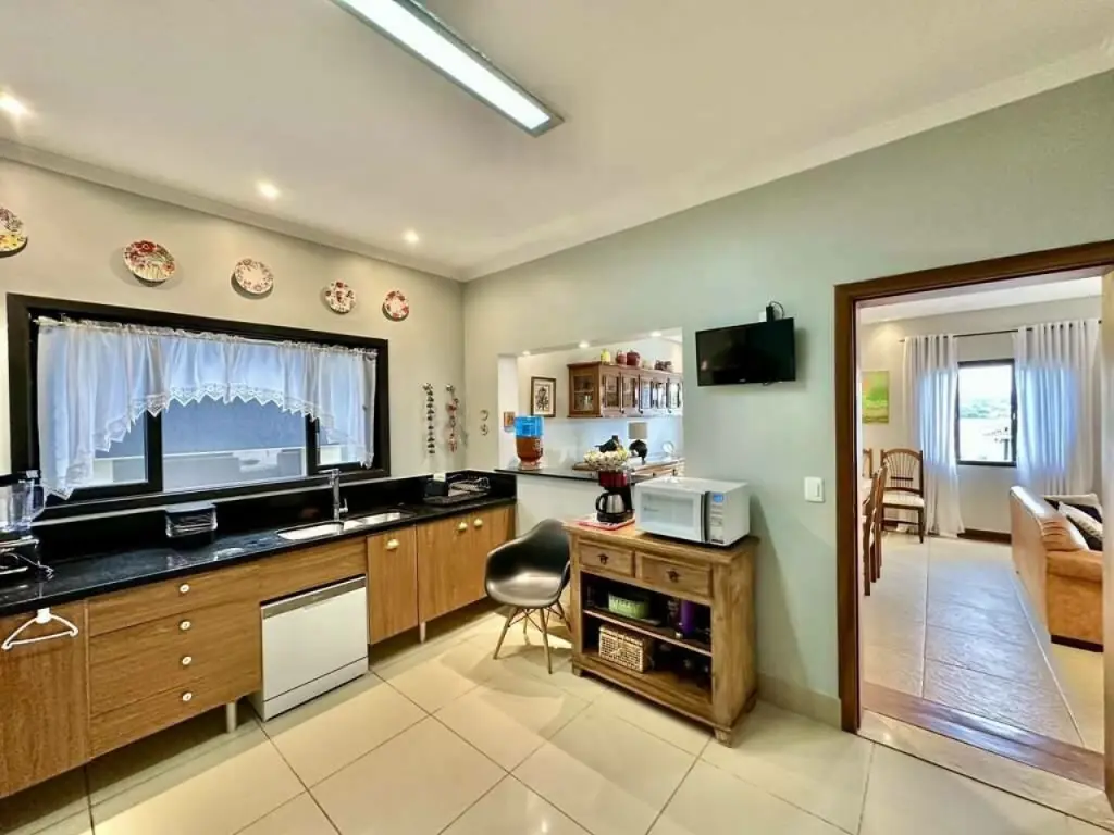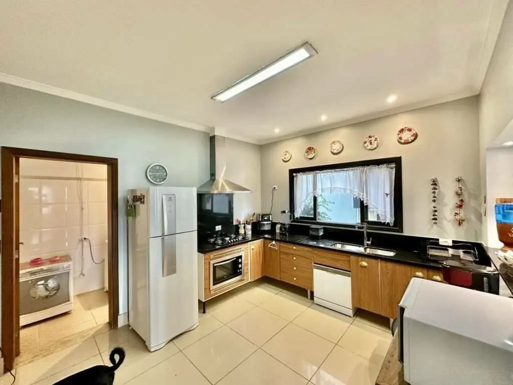 Cozinha integrada à sala de jantar por passa pratos, com despensa, armários, forno de embutir, exaustor e com 2 cubas.