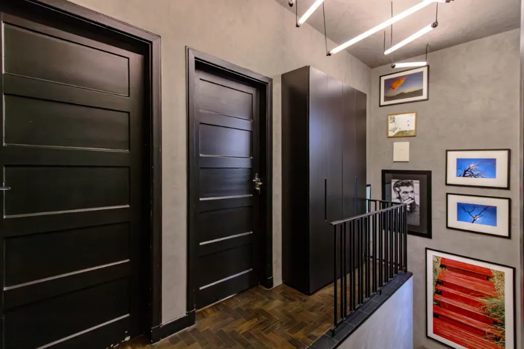 Uma elegante escada de aço corten leva ao segundo piso, onde a privacidade e o conforto são prioridades: são três quartos amplos, sendo duas suítes aconchegantes. A suíte principal é um verdadeiro refúgio, com um banheiro que oferece cuba e ducha duplas e uma relaxante sauna a vapor, garantindo momentos de puro bem-estar. A varanda coberta e aconchegante neste andar é o local perfeito para desfrutar de um café da manhã tranquilo ou um final de tarde relaxante. Um dos quartos é atualmente usado como closet e escritório e a outra suíte comporta uma sala de TV ou um ateliê, escritório. O segundo piso é inteiro de taquinho, escurecido na cor tabaco. Há também a possibilidade de se construir um rooftop, criando uma escada até a laje a partir de um dos quartos.