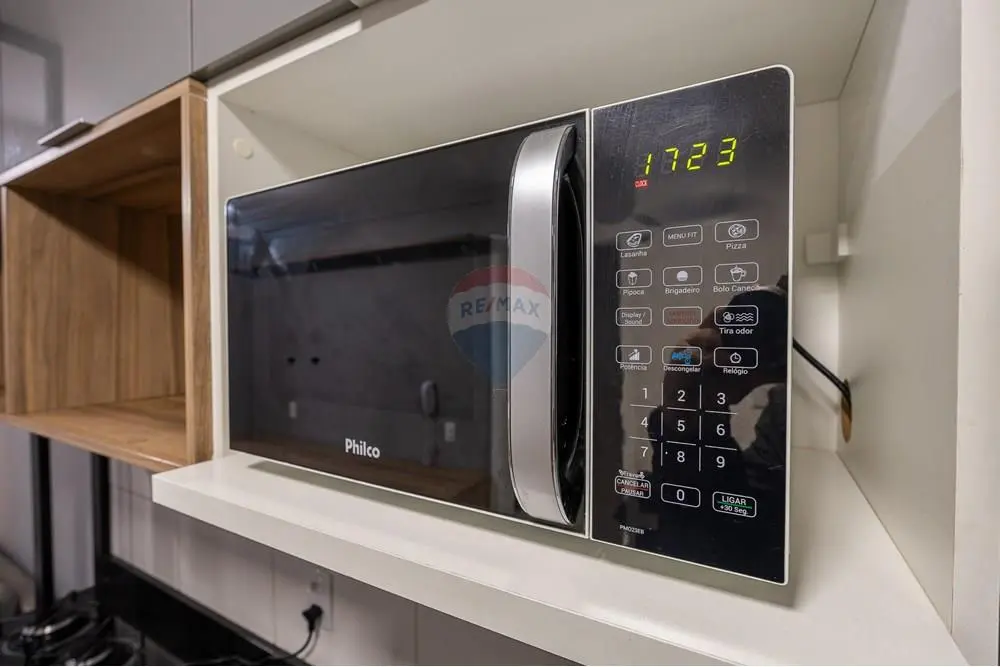 Este apartamento de 37 metros quadrados está totalmente mobiliado e pronto para morar ou alugar. Possui 1 quarto com cama de casal, colchão e guarda-roupa planejado, banheiro com box de vidro, cozinha equipada com armários planejados, geladeira, micro-ondas e máquina lava e seca. A sala conta com sofá e rack para TV.