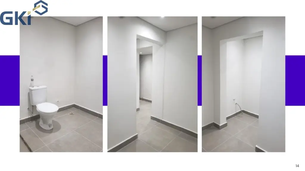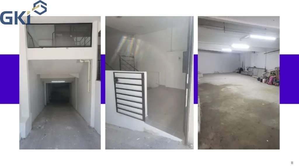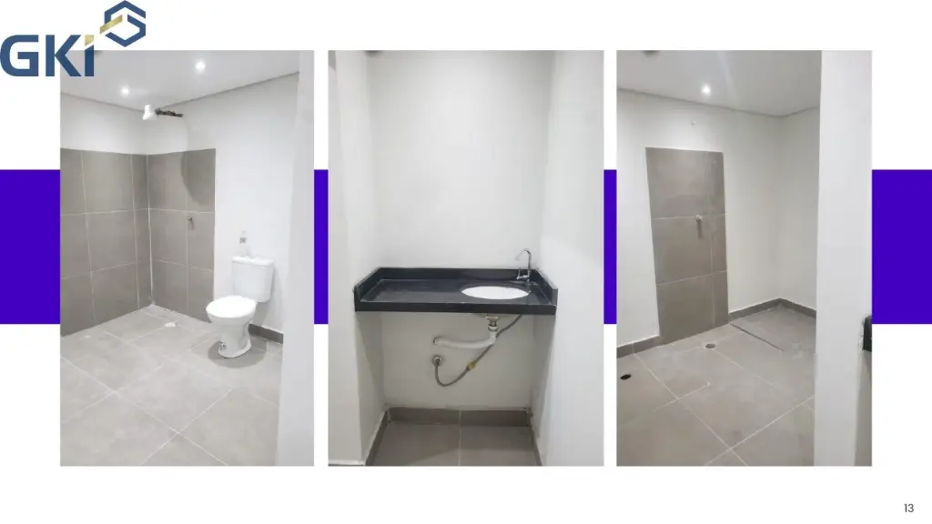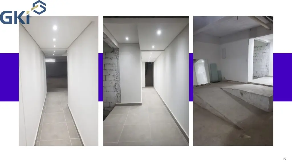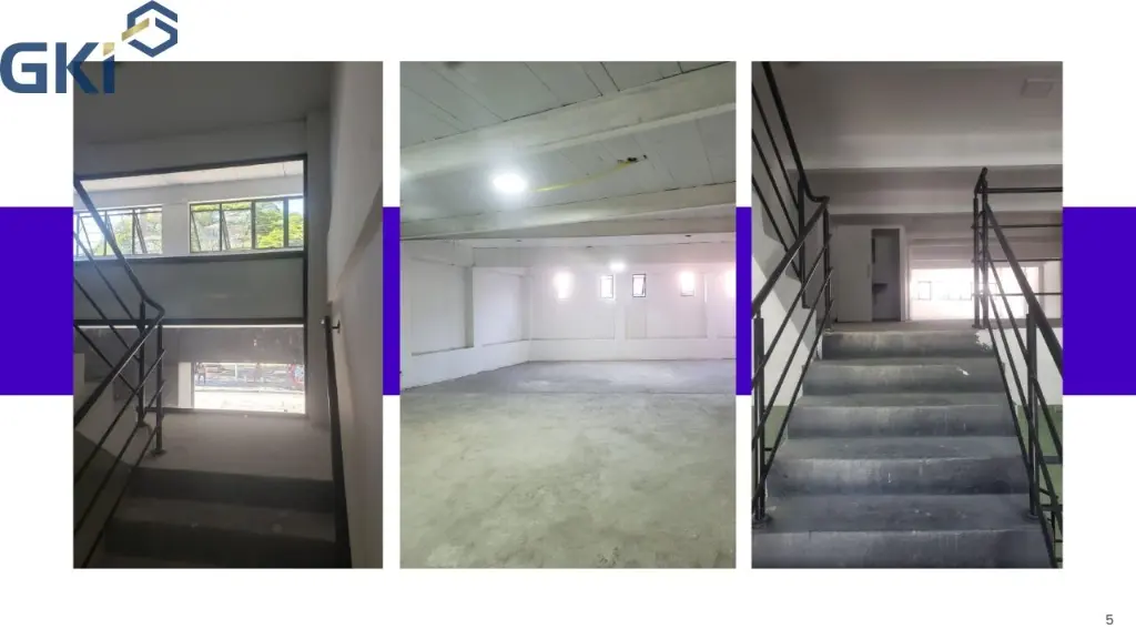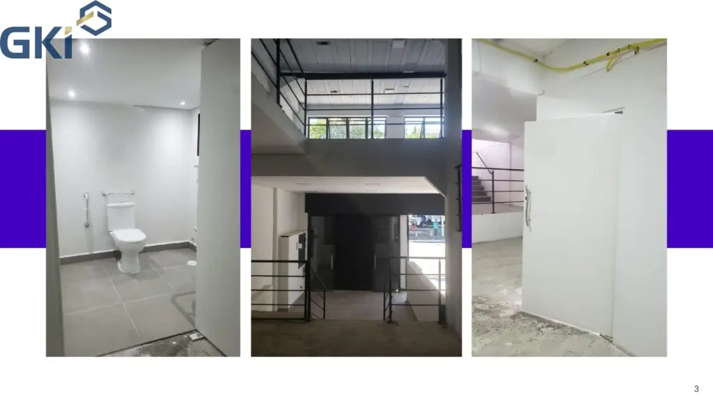 Com Hall, Mezanino, área de circulação, vestiário feminino e masculino, estacionamento no subsolo com rampa de acesso, espaço para colocar elevador, 5 banheiros e 1 banheiro para cadeirante e depósito.