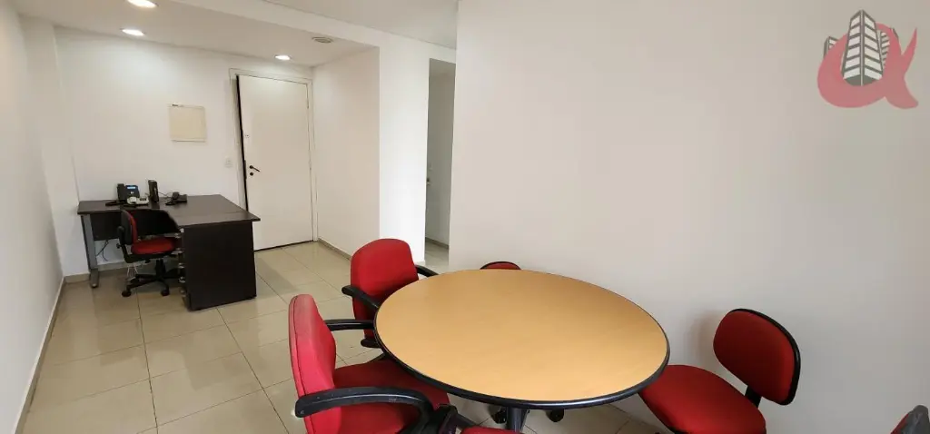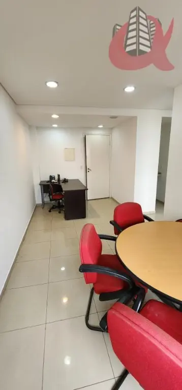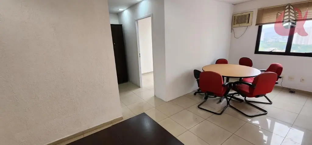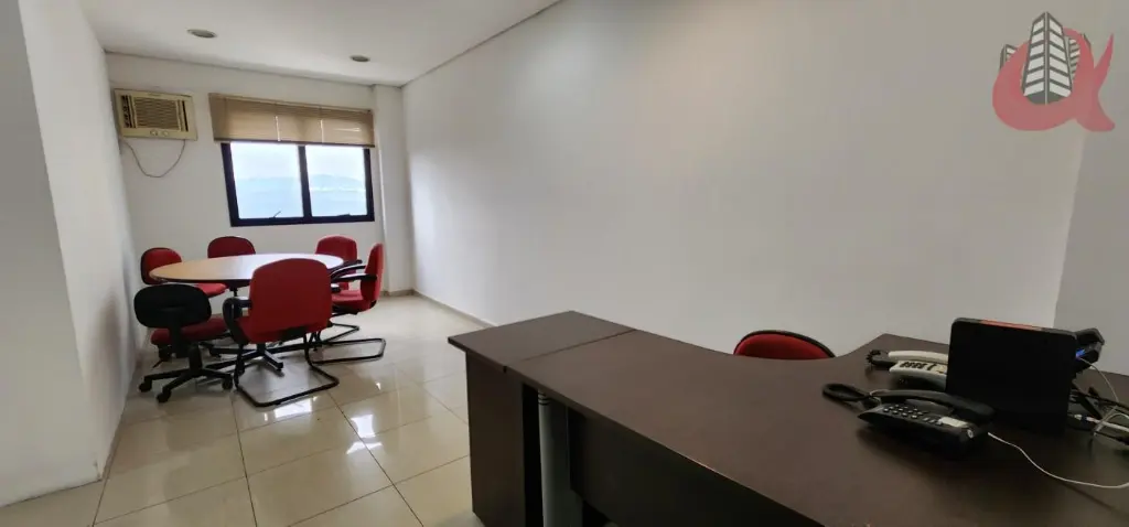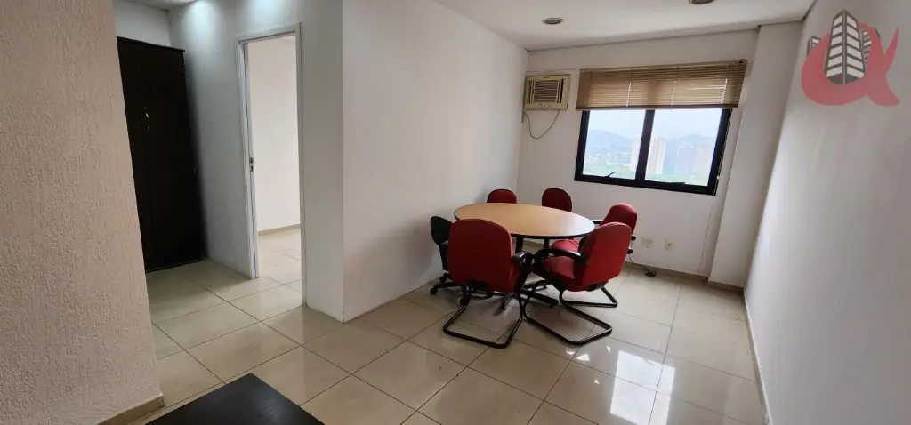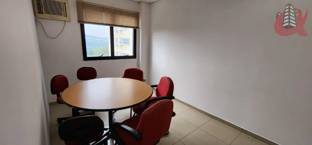 Sala comercial com total de 35m. Entradarecepção mais um espaço aberto integrado com a recepção e outra sala fechada com divisoriaporta e ar condicionado. Com mesas, cadeiras. Com janelas. Ar condicionado. 1 banheiro e 1 Copa com frigobar. Moveis planejados. Estrutura ja com cabeamento para internet rapida. Silencio total. Andar alto. Vista privativa. Sol da tarde. Venha visitar.