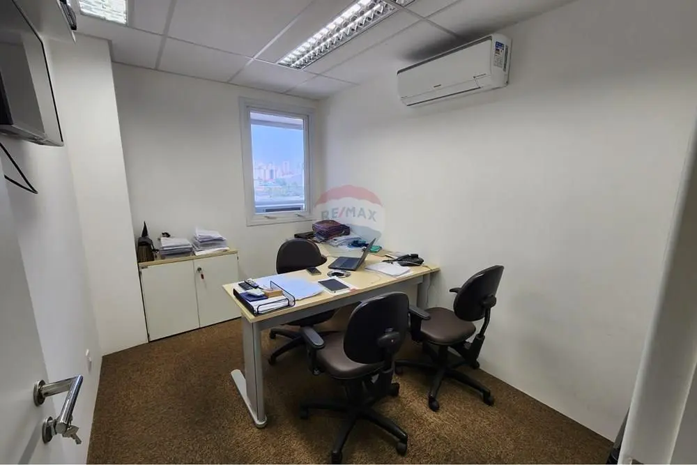 Sala de reunião, estação de trabalho e ar condicionado