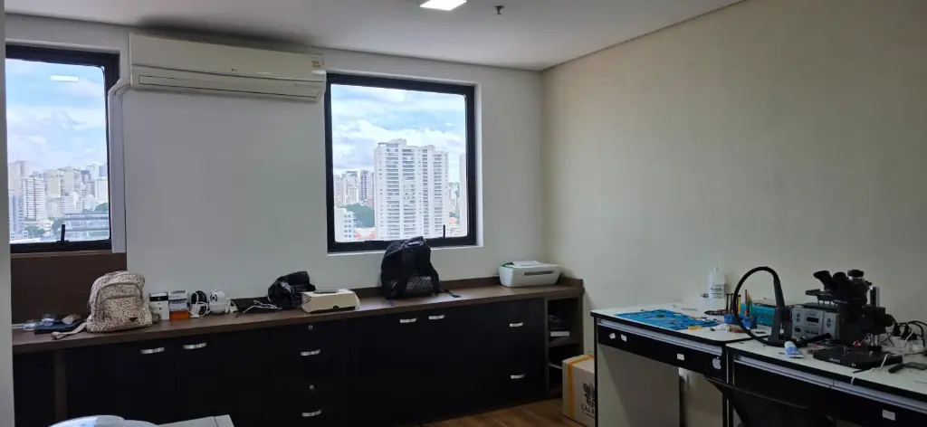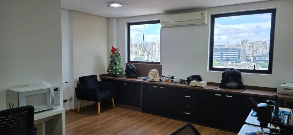 Sala comercial com 27 m², muito bem distribuída, contando com 1 banheiro privativo e ar-condicionado instalado e 1 vaga de garagem, pronta para uso.
