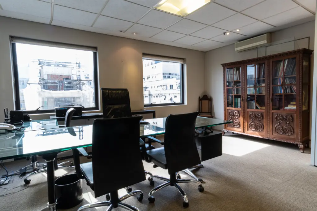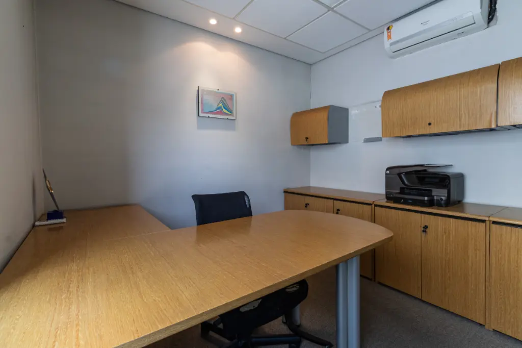Com aproximadamente 195 m² de área total e 84 m² de área útil, o imóvel conta com hall de entrada, quatro salas, dois banheiros com bancadas em granito e louças modernas, além de uma copa equipada com bancada em granito, cuba inox e armários. O acabamento inclui piso laminado em excelente estado, forro de gesso com luminárias embutidas, pintura recente e ar-condicionado tipo split em todos os ambientes. O conjunto dispõe ainda de três vagas de garagem exclusivas.