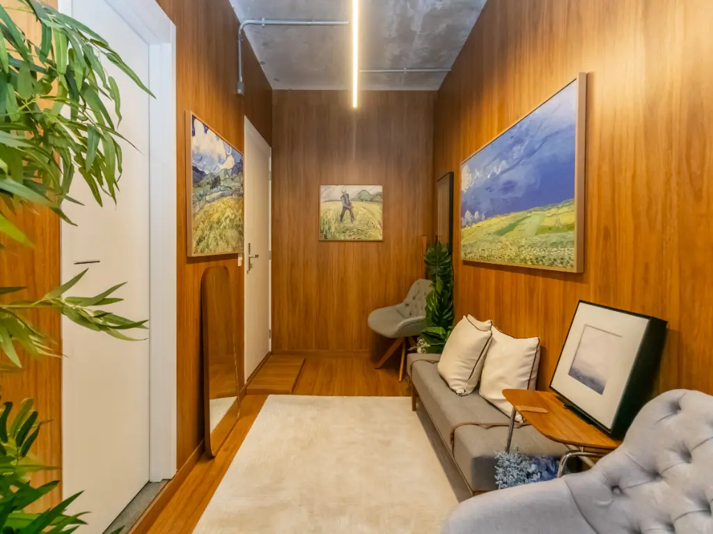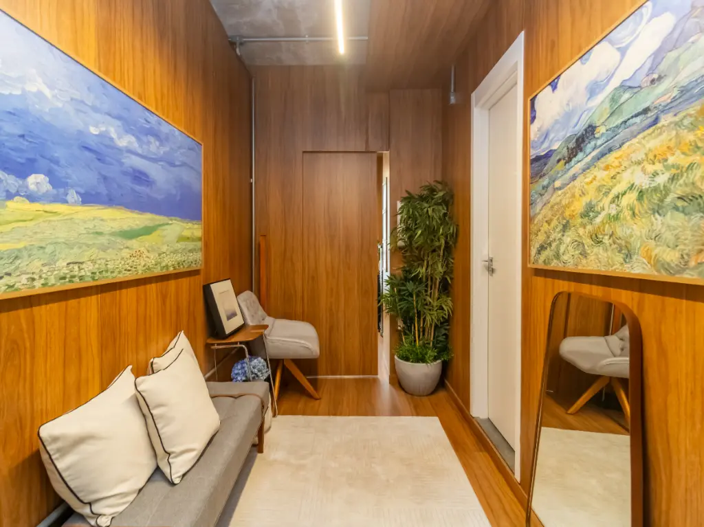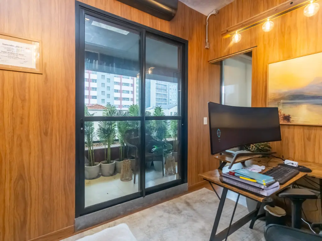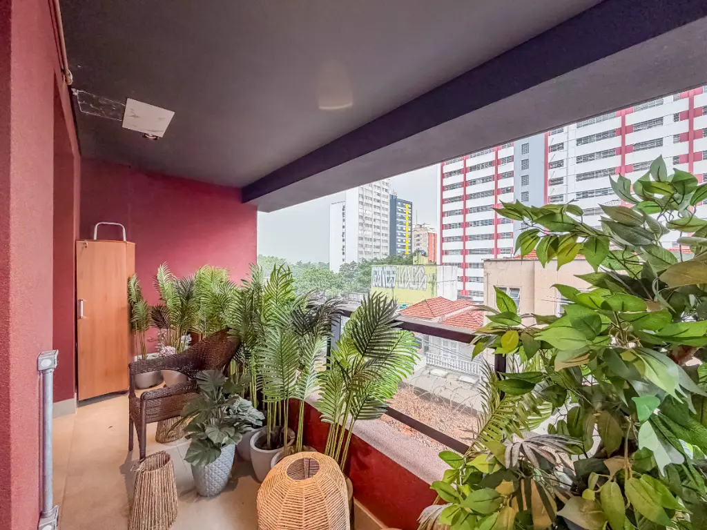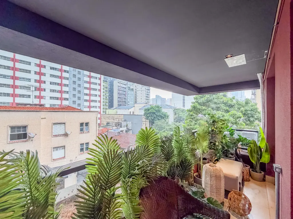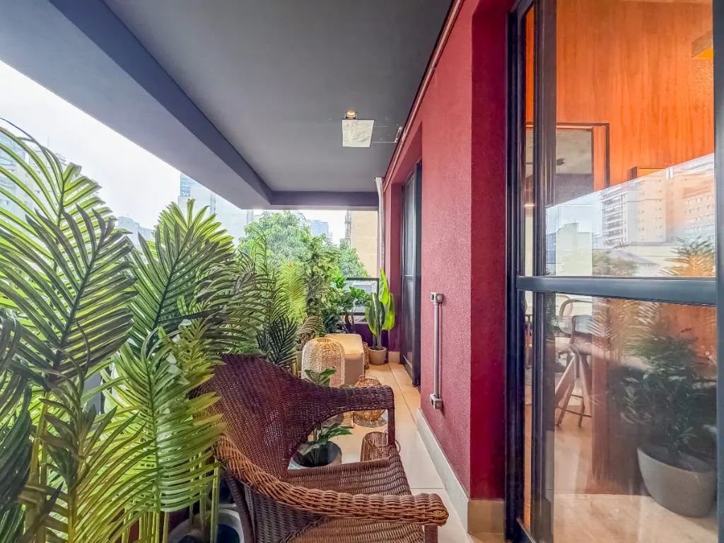 Possui banheiro e uma ampla varanda com vista para o Jardim Europa