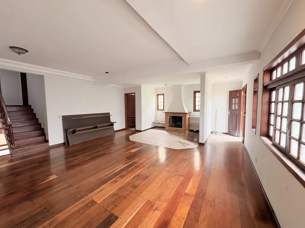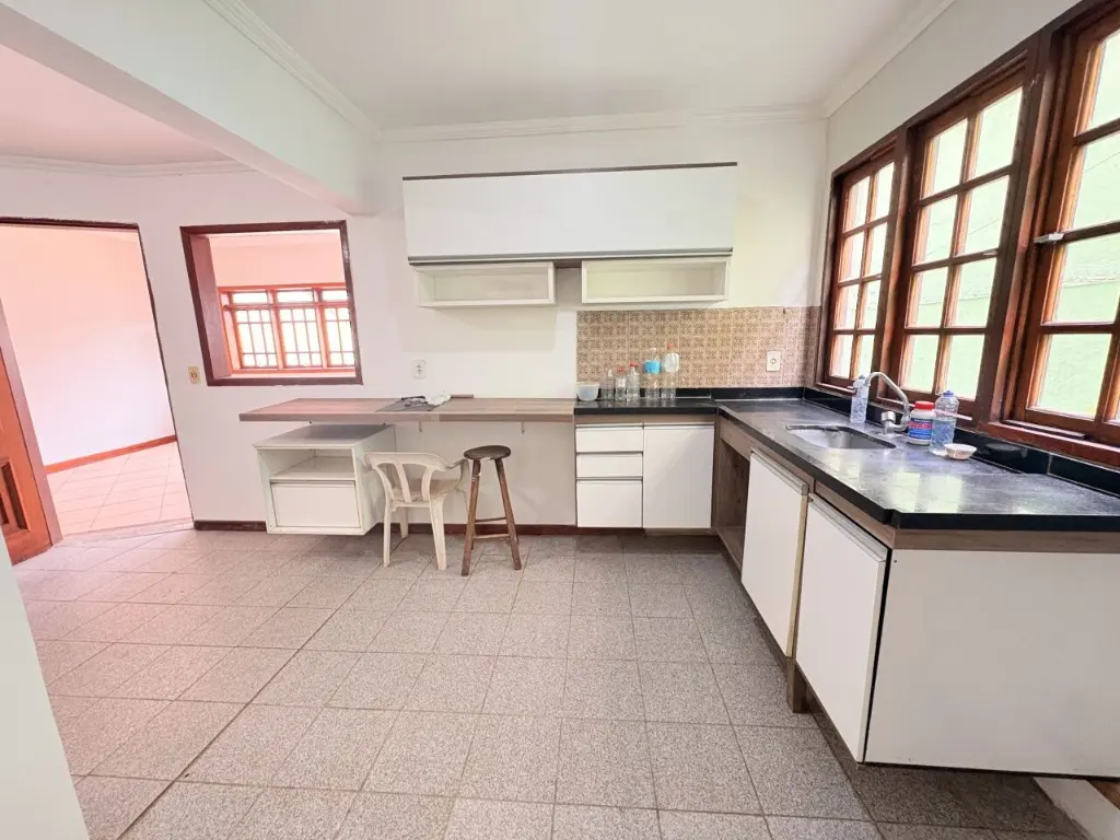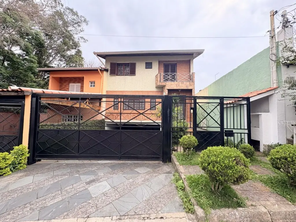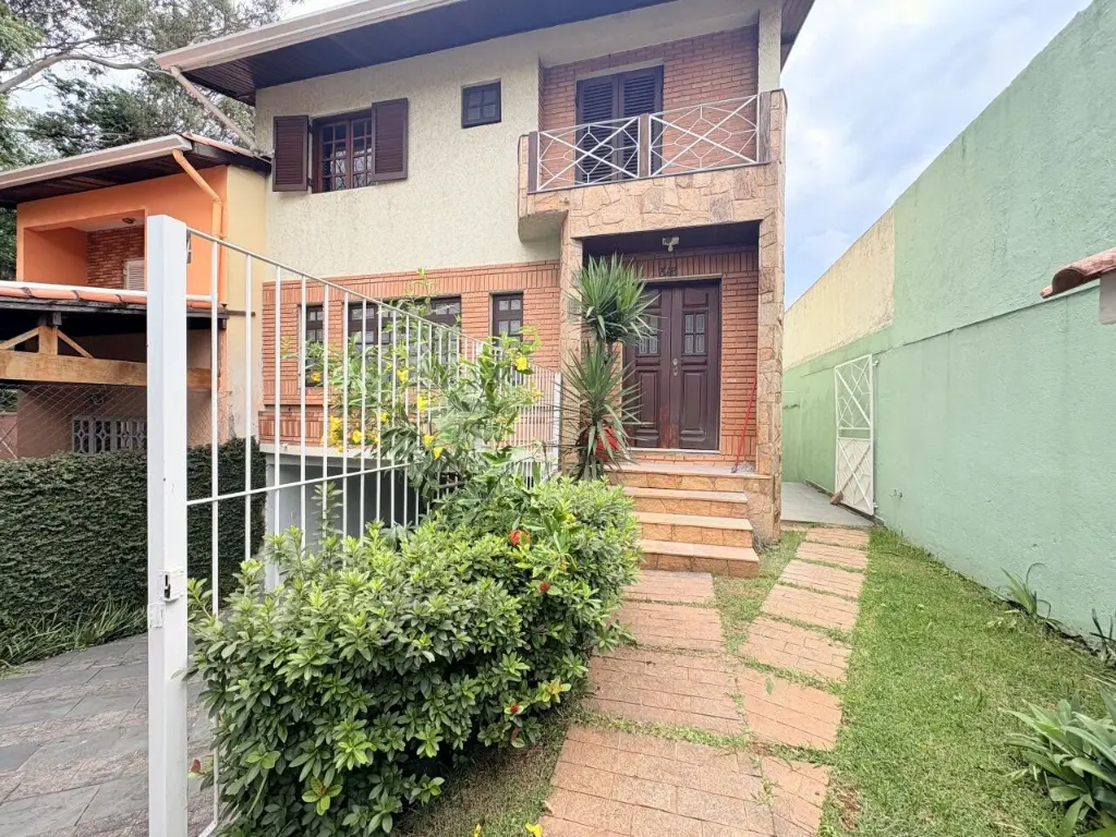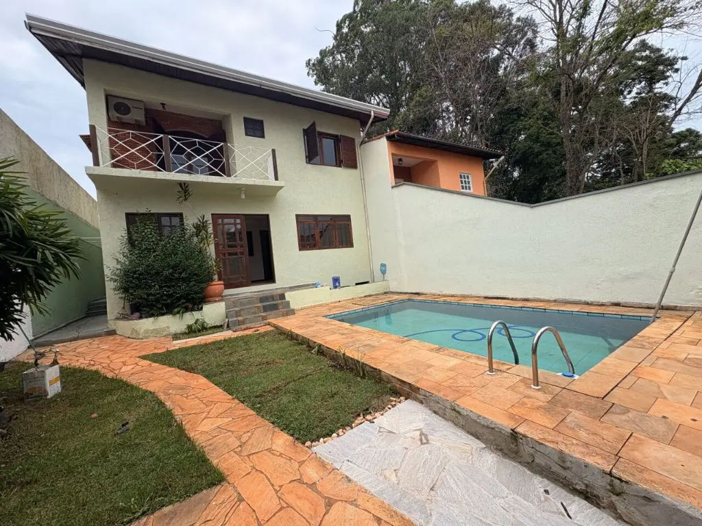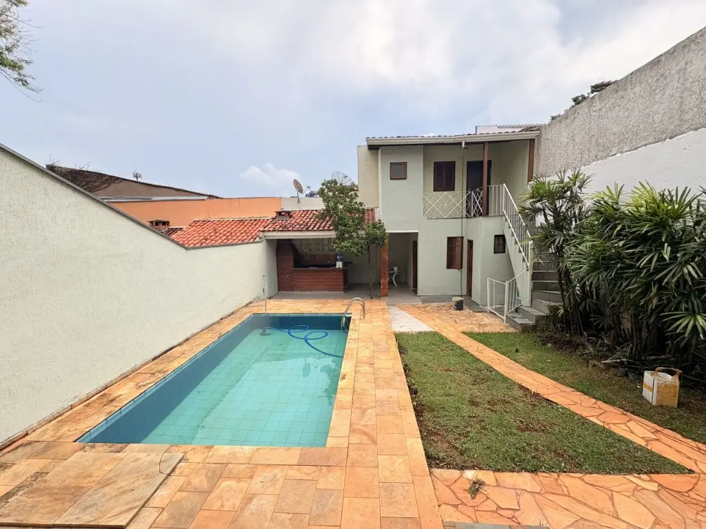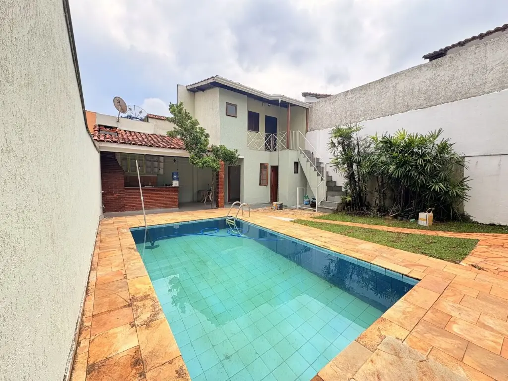 Casa assobradada para alugar com 4 quartos, sendo 4 suítes com 1 banheira, 6 banheiros no total, sacada, espaço externo com churrasqueira e piscina, edicula com banheiro, corredor lateral, jardim, vaga para 4 carros.
