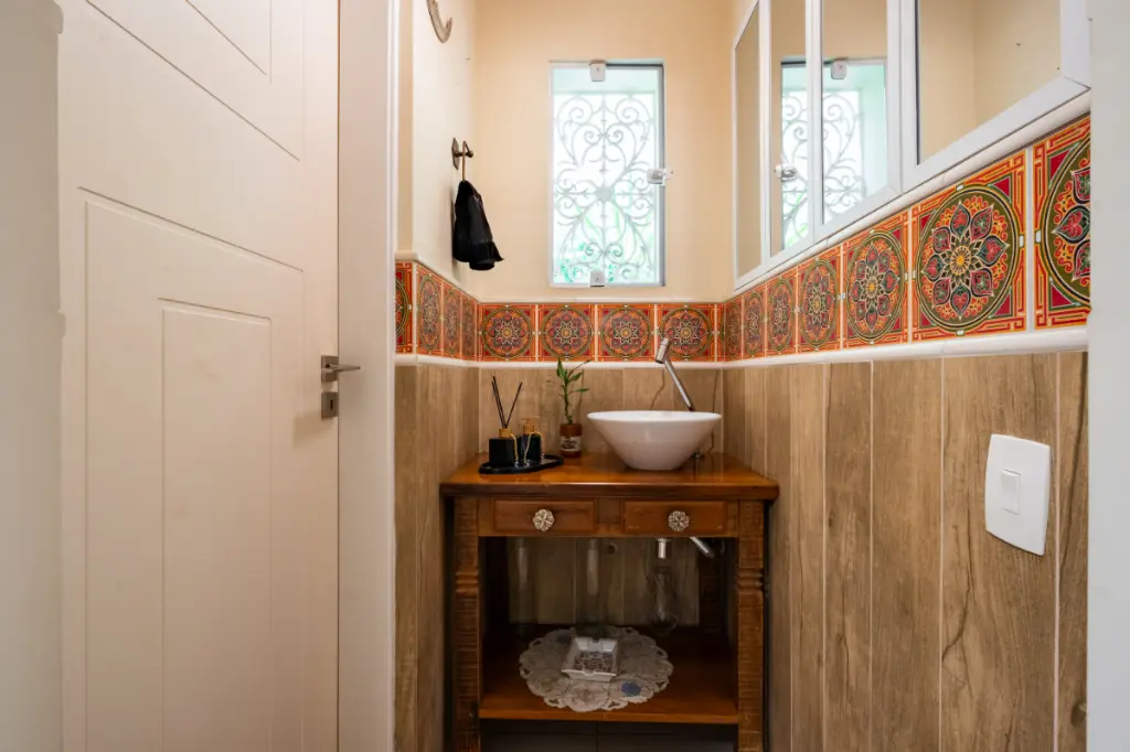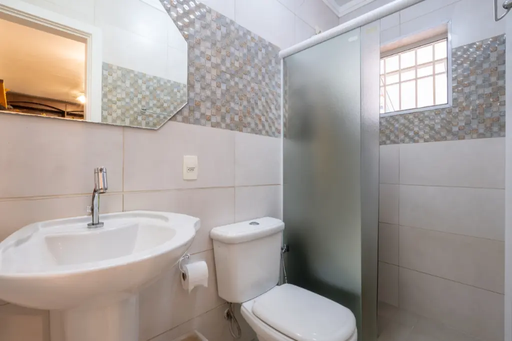 Todos os banheiros possuem ventilação e luz natural. A escada em madeira maciça conecta os ambientes com imponência e elegância.