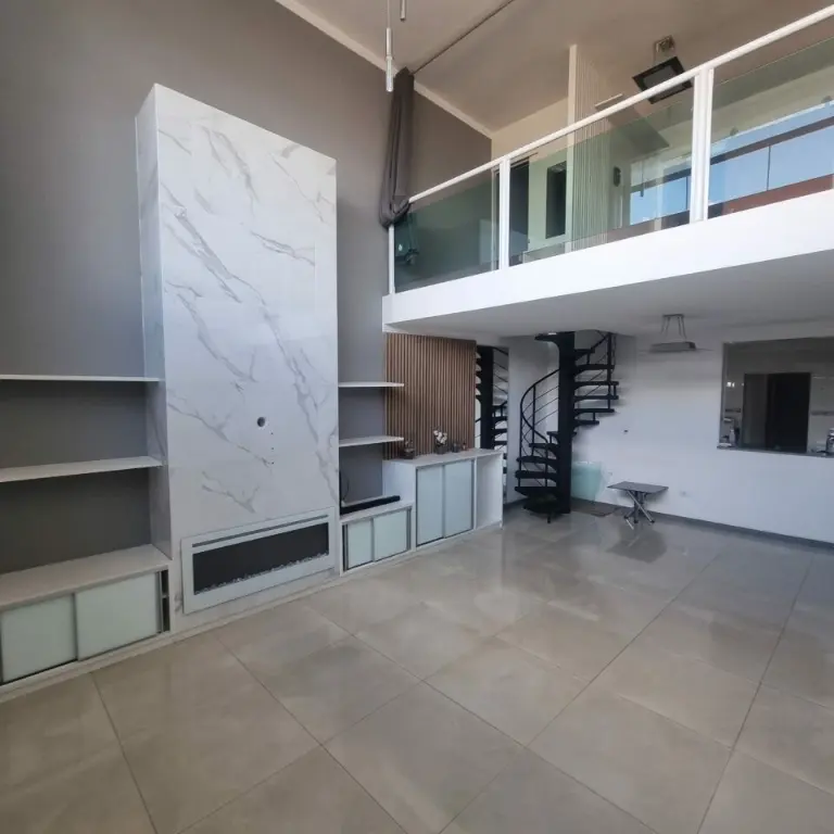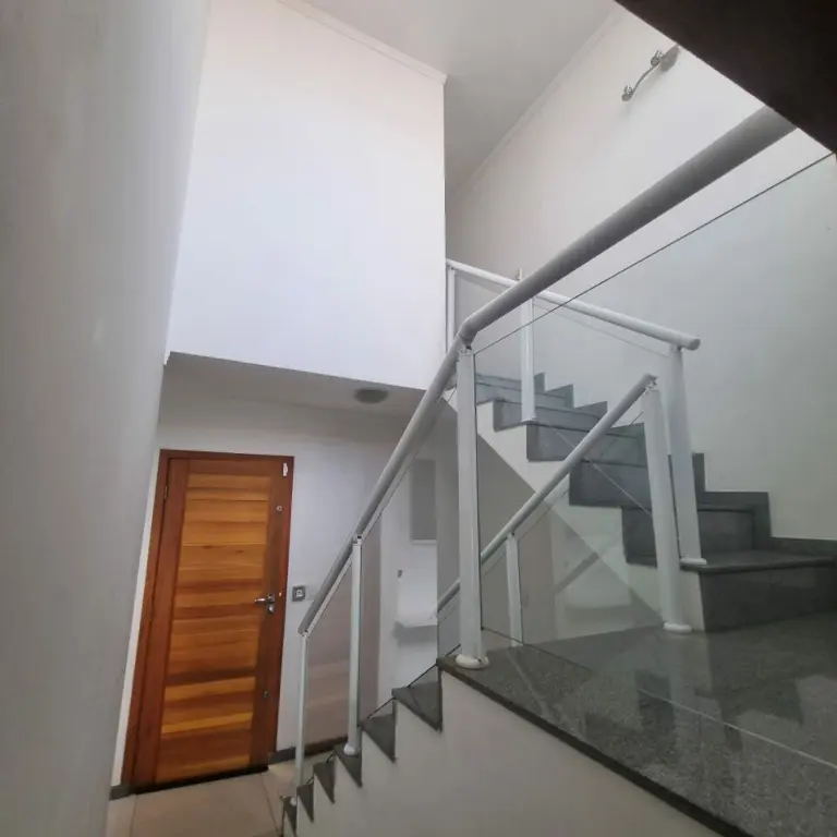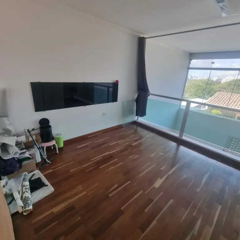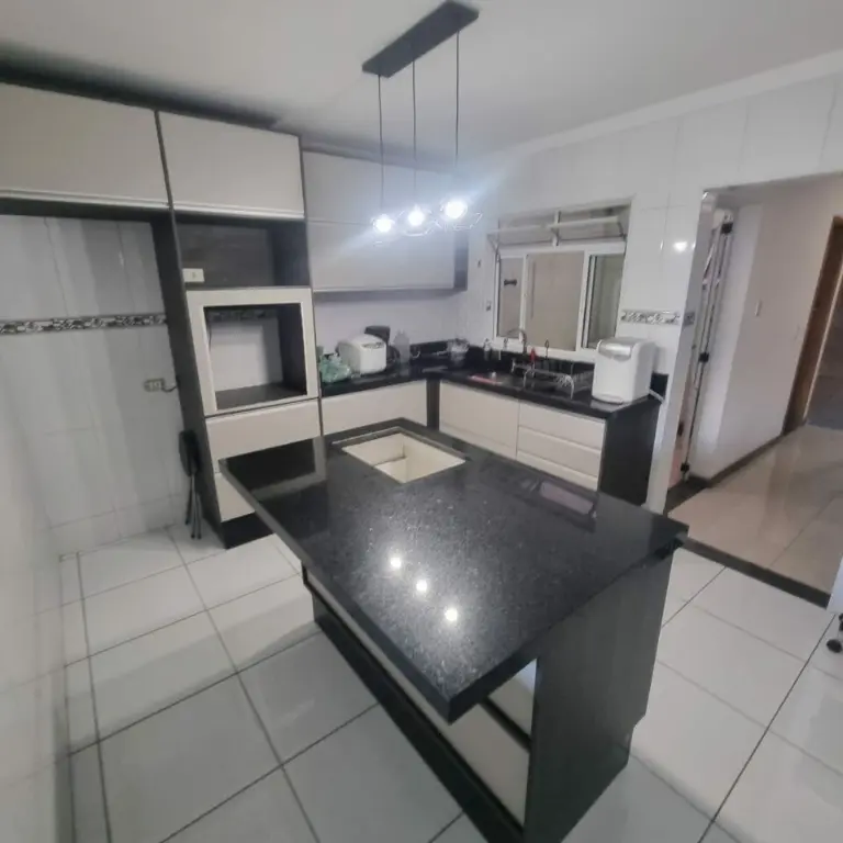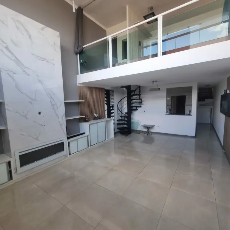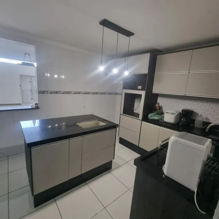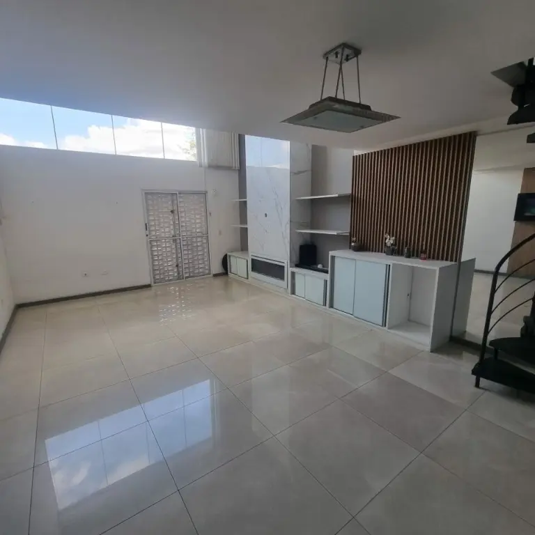 Cozinha americana, sala de estar. Om pé direito alto, lareira elétrica com aquecedor, quintal com churrasqueira