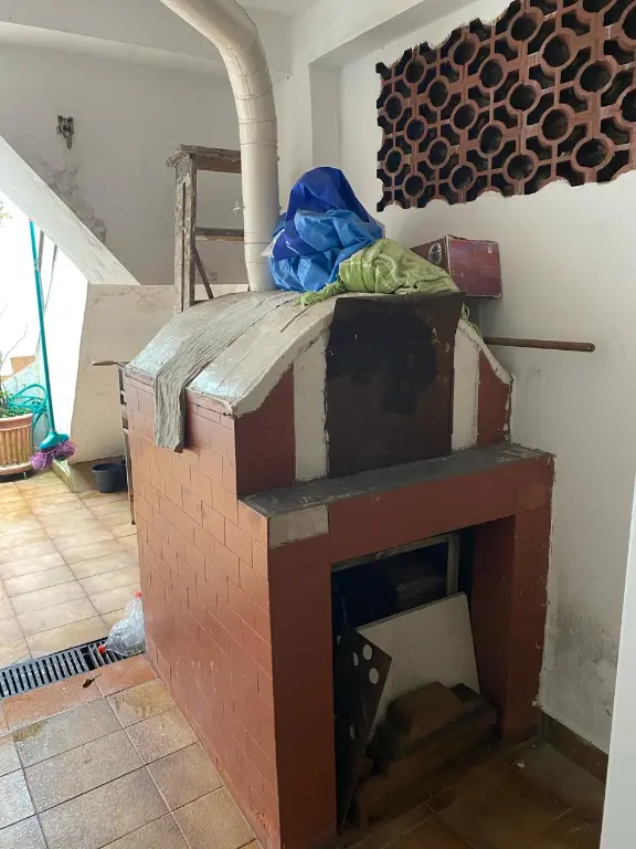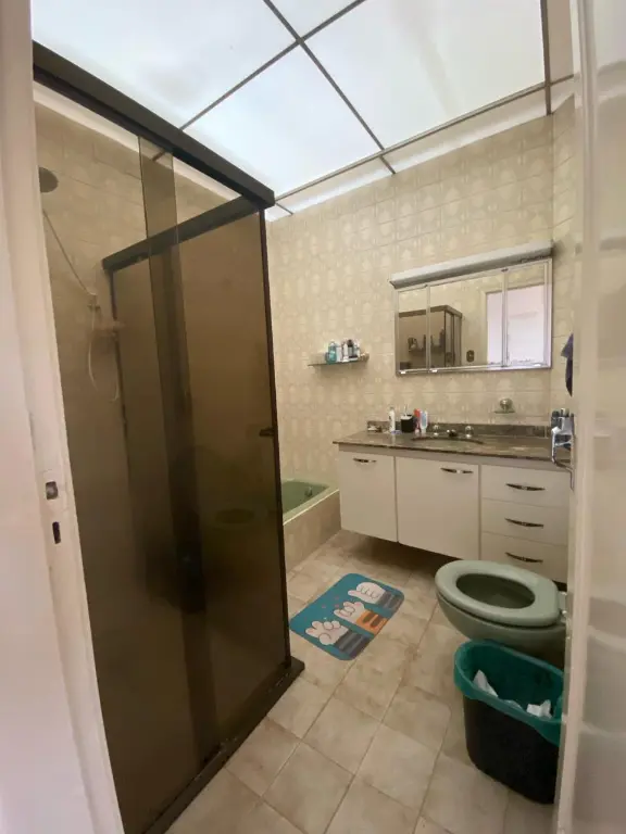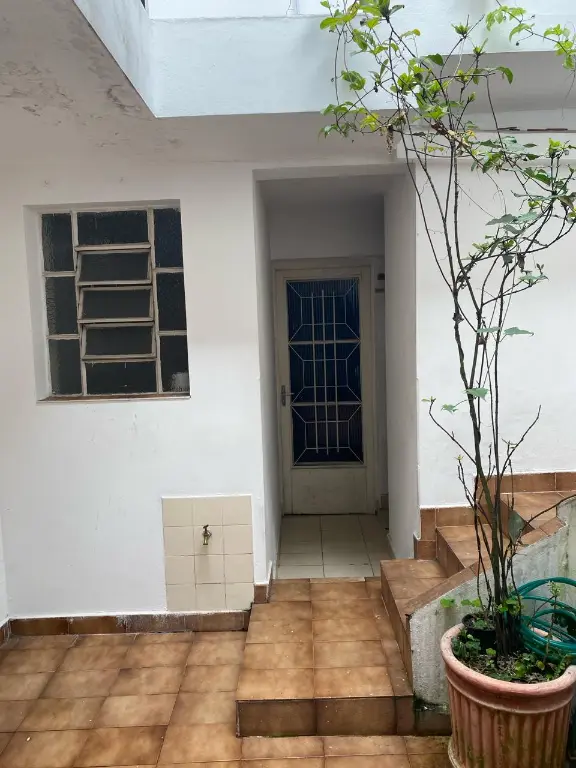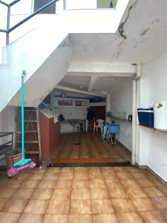Embaixo tenho uma suíte, pequeno quintal com churrasqueira