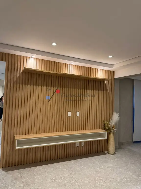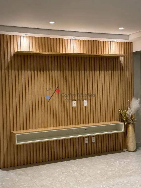 Painel ripado em madeira natural, com rack suspenso sob medida e iluminação embutida