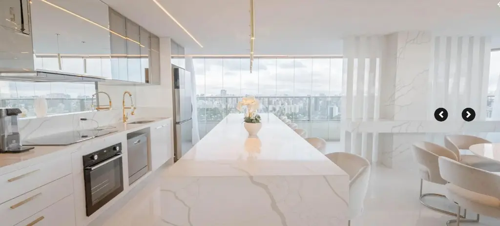 Além disso, há um espaço de contemplação exclusivo, criado especialmente para observar a melhor vista da cidade, proporcionando uma experiência única e relaxante. A área de jantar e a bancada foram projetadas para até 14 pessoas, promovendo conforto em eventos e reuniões familiares.