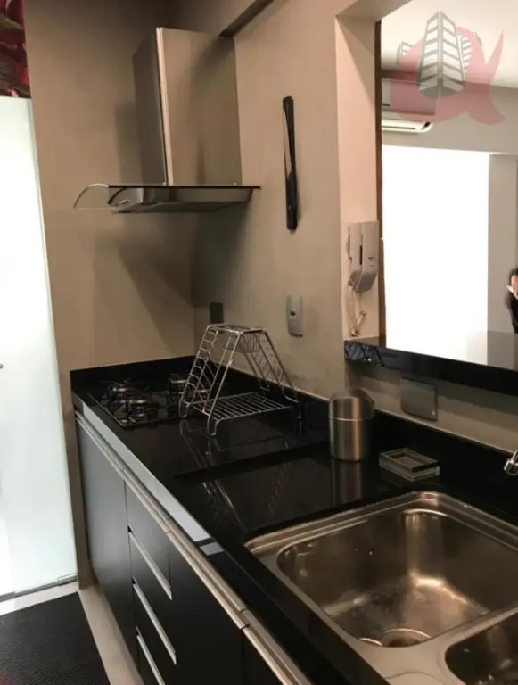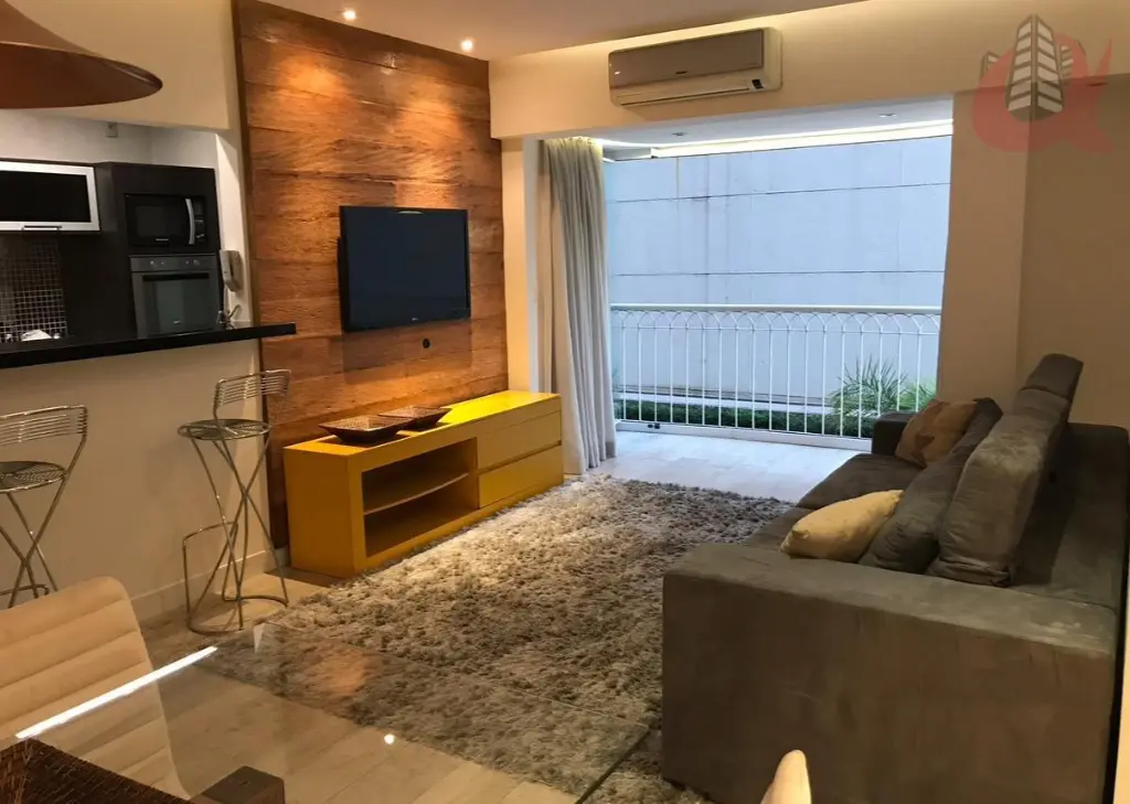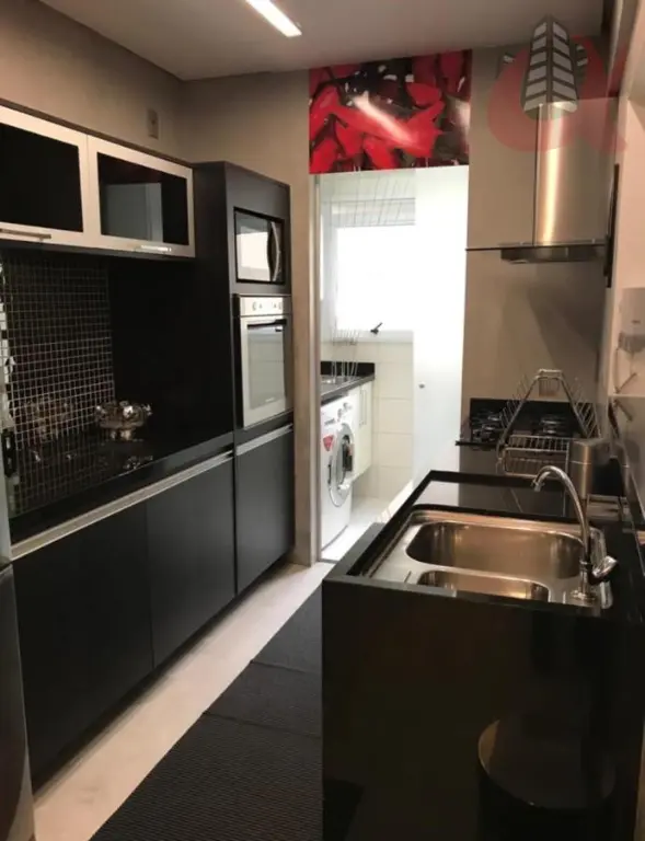A sala de estar em dois ambientes integrada à varanda estendida. A cozinha americana é equipada com armários modernos e eletrodomésticos em aço inox, incluindo cooktop, geladeira inverse, forno elétrico e micro-ondas.