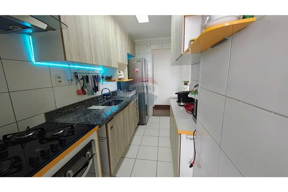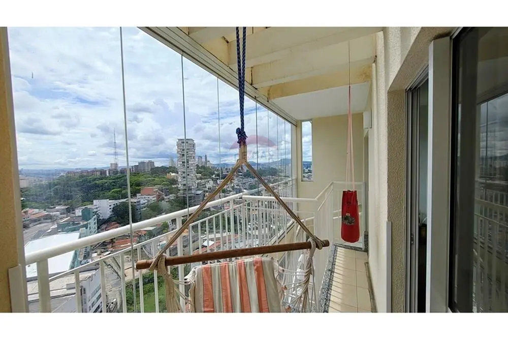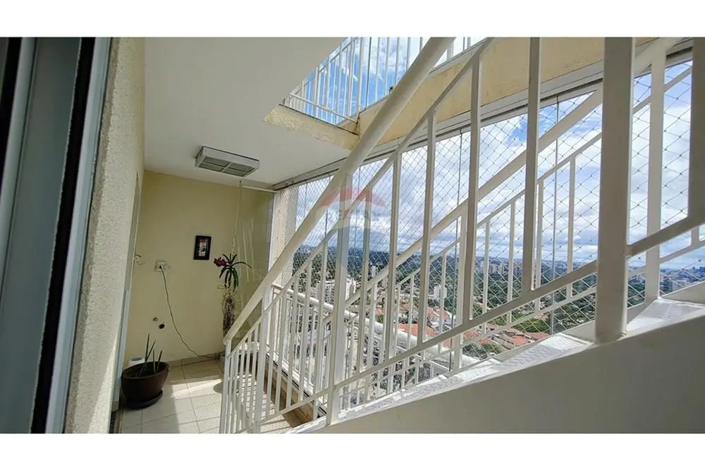Apartamento com 2 dormitórios (1 suíte), sala ampla, cozinha com planejados e lavanderia com armário, sacada ampla com escada para acesso ao andar superior e vidro na sacada.