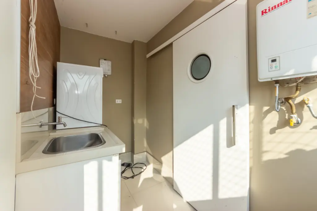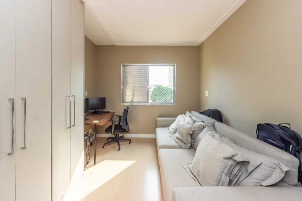 O imóvel conta com 2 quartos confortáveis e 1 banheiro bem planejado. A grande versatilidade está na dependência de serviço completa, que atualmente é utilizada como suíte para home office, demonstrando a flexibilidade dos espaços. Esta área pode servir como, escritório, quarto de hóspedes, atelier, etc, adaptando-se perfeitamente às suas necessidades.