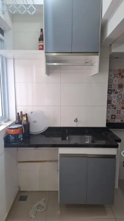 Cozinha planejada, prática e funcional, integrada à área de serviço;