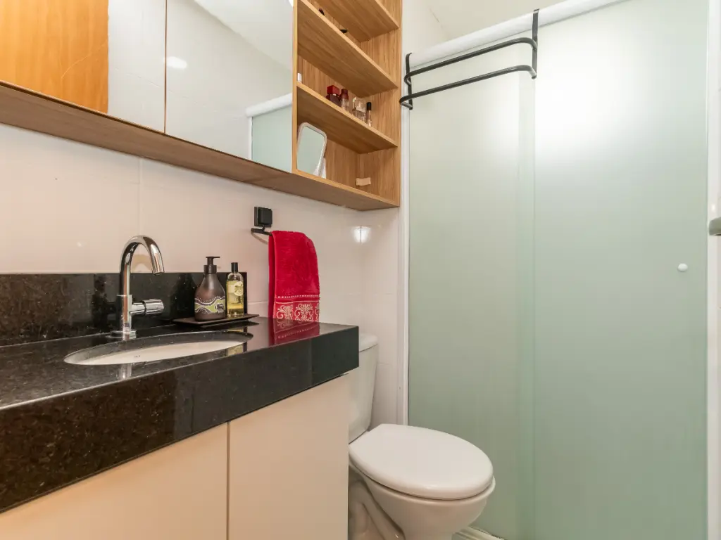Banheiro completo com marcenaria sob medida e box de vidro.