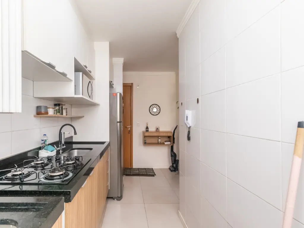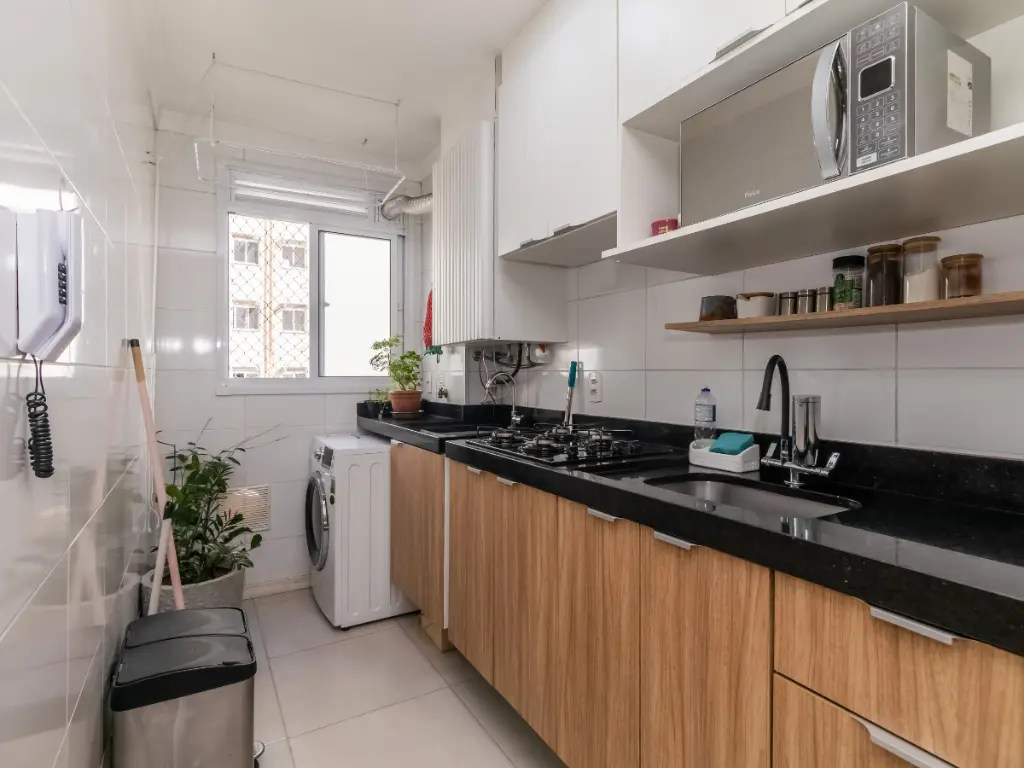 Cozinha funcional com marcenarias fixas e cooktop, além de aquecimento a gás para economia no dia a dia.