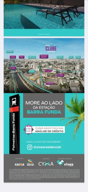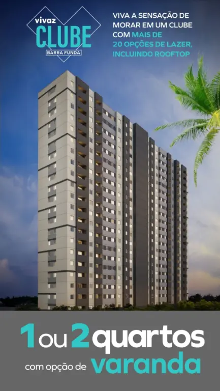 O Vivaz Clube Barra Funda é um condomínio residencial na Zona Oeste de São Paulo (Av. Marquês de São Vicente, 1000) focado em apartamentos de 1 a 2 dormitórios (24m² a 36m²), muitos com opções de varanda, sem vaga de garagem. Integrado ao programa Minha Casa Minha Vida, o empreendimento oferece lazer completo, incluindo piscina, academia, coworking e lavanderia.