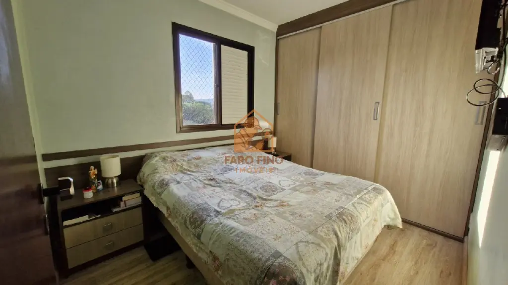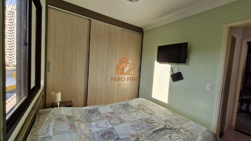 O quarto principal é bem iluminado e conta com armários planejados com portas de correr, ar condicionado.