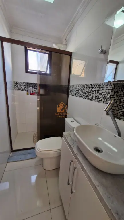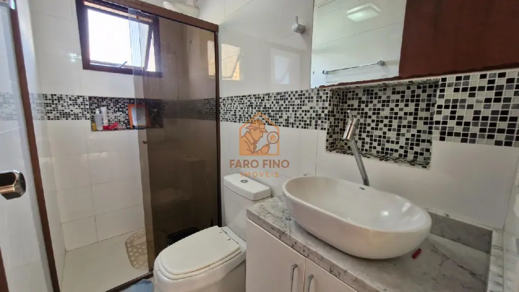O banheiro tem ventilação natural, chuveiro elétrico, gabinete com pia em porcelana branco, box de vidro fumê.