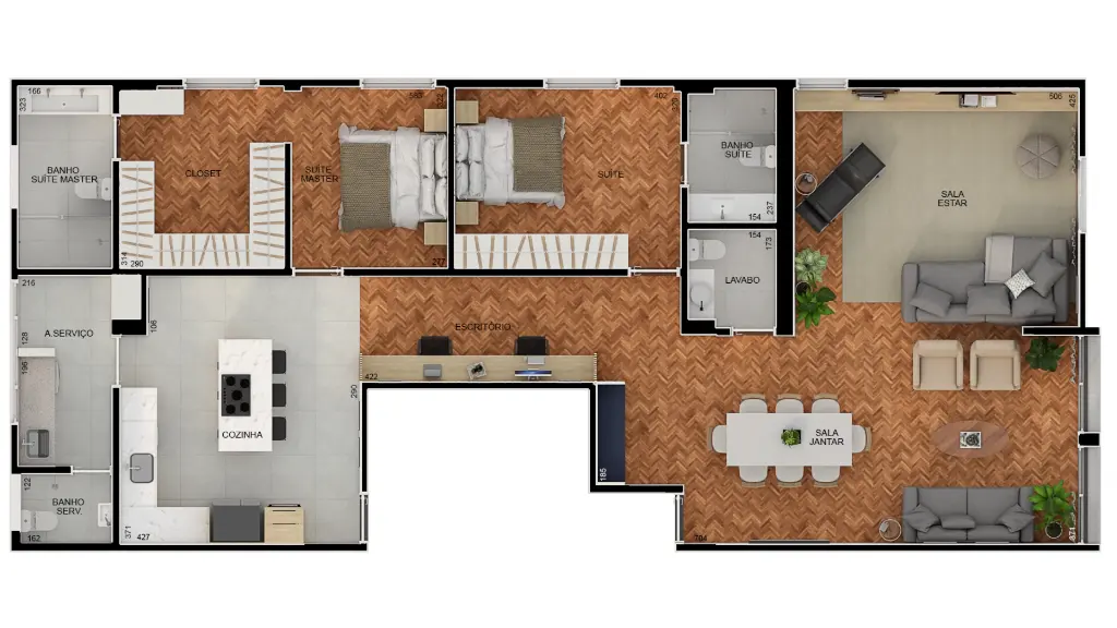 02 Suítes sendo uma máster/ Lavabo/ Escritório/ Sala ampla para três ambientes