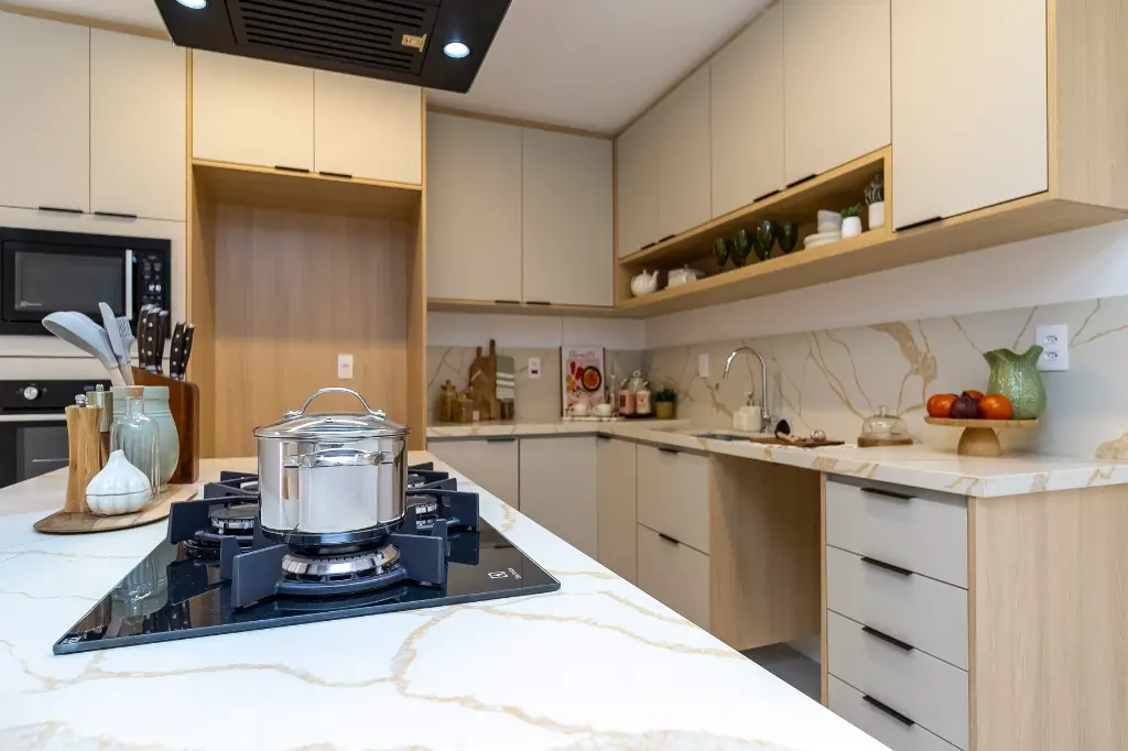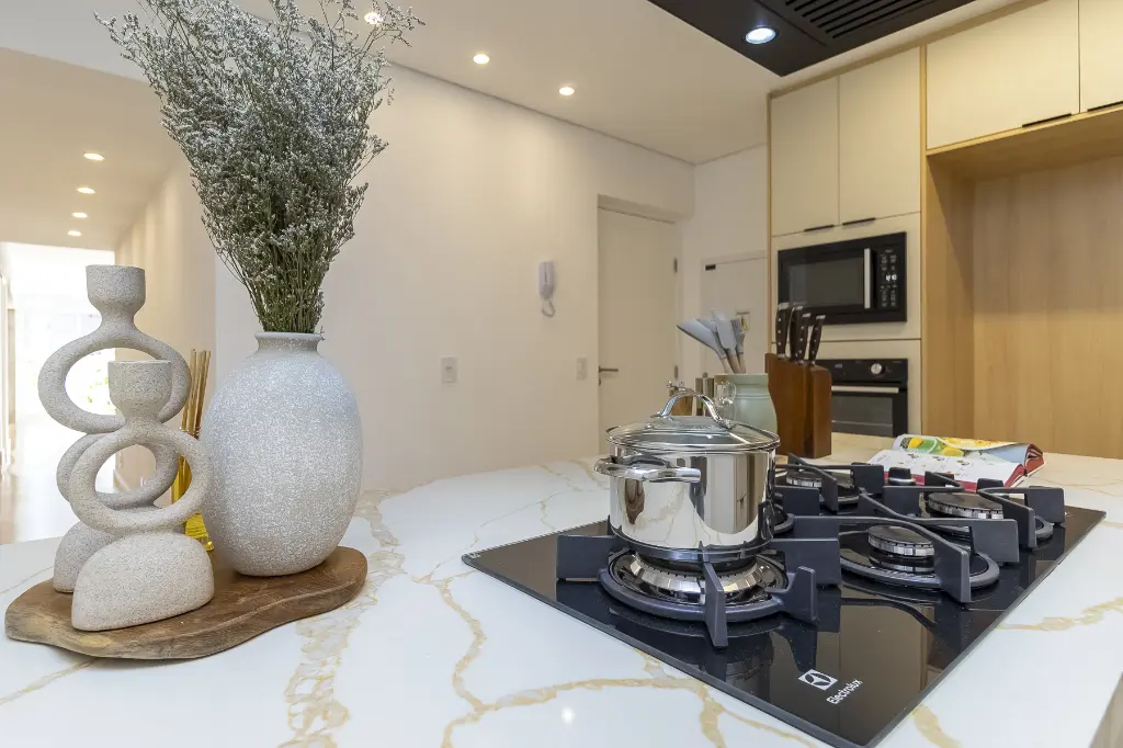 O apto está sendo entregue com marcenaria (cozinha, área de serviço e banheiros), aquecedor a gás, cooktop, coifa e forno.