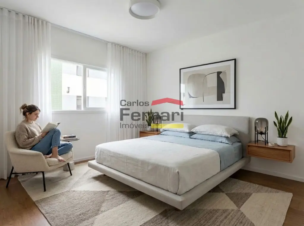 Dormitório espaçoso e funcional: O quarto tem um ótimo tamanho e já conta com armários planejados de qualidade, garantindo espaço suficiente para organizar suas roupas e pertences sem comprometer a circulação.