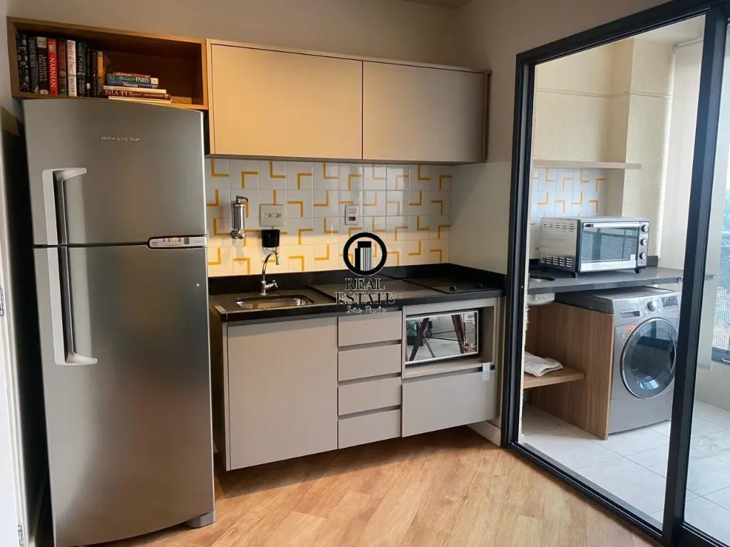 Apartamento à Venda - 32m, 1 Quarto, 1 Vaga - Pinheiros Imóvel especial, semi-novo, arquitetura autoral com móveis do designer Fernando Jaeger. Não há nenhum semelhante no prédio. O apto é de 1 Suíte, Sala, Cozinha integrada e Varanda gourmet com fechamento envidraçado. Está 100% equipado com Ar Condicionado em todos ambientes (inclusive varanda), Geladeira inox com freezer, Cooktop vitrocerâmico, Forno elétrico, Microondas, TV 40?, Lava-Seca, iluminação LED, marcenaria de primeira linha, Sofá-cama, mesa de trabalho, cama Queen-Size e Blackout.
