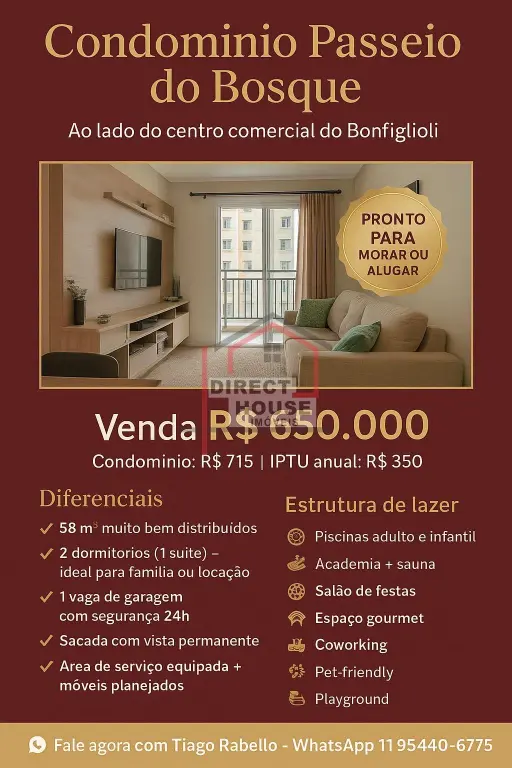 ?? Apartamento à venda no Condomínio Passeio do Bosque ?? Avenida Otacílio Tomanik, 350 - São Paulo ?? 58m² Imagine morar ou investir em um imóvel que une conforto, segurança e valorização garantida. Perfeito para quem valoriza praticidade, lazer completo e localização estratégica. ? Características e benefícios: ?? 2 quartos, sendo 1 suíte - ideal para família ou locação ?? 1 vaga de garagem com segurança ?? Sacada com vista permanente - luz natural e amplitude ?? Área de serviço equipada e móveis planejados - pronto para morar ou alugar ?? Acabamento premium: piso laminado e porcelanato ?? Lazer e conveniência no condomínio: ???? Piscinas adulto e infantil ?? Academia completa e sauna ?? Salão de festas, espaço gourmet e churrasqueira ?? Salão de jogos e coworking ?? Playground, brinquedoteca e espaço pet ?? Quadra poliesportiva e bosque ?? Portaria 24h e bicicletário ?? Localização estratégica: ?? Ao lado de centro comercial com lojas, supermercados e bancos ?? Fácil acesso às principais avenidas e Rodovia Raposo Tavares ?? Próximo ao metrô Vila Sônia, USP e hospitais ?? Região com valorização contínua - ótima para investimento seguro ?? Valores e oportunidade: ?? Preço de venda: R$ 650.000 ?? Condomínio: R$ 715 ?? IPTU anual: R$ 350 ?? Por que este apartamento é uma escolha inteligente: Pronto para morar ou alugar Lazer completo e infraestrutura que agrega qualidade de vida Localização estratégica com alta liquidez e valorização ?? Não perca essa oportunidade! Agende sua visita e garanta seu novo lar ou investimento seguro. ?? Tiago Rabello - CRECI 159.740 ?? WhatsApp: 11 95440-6775