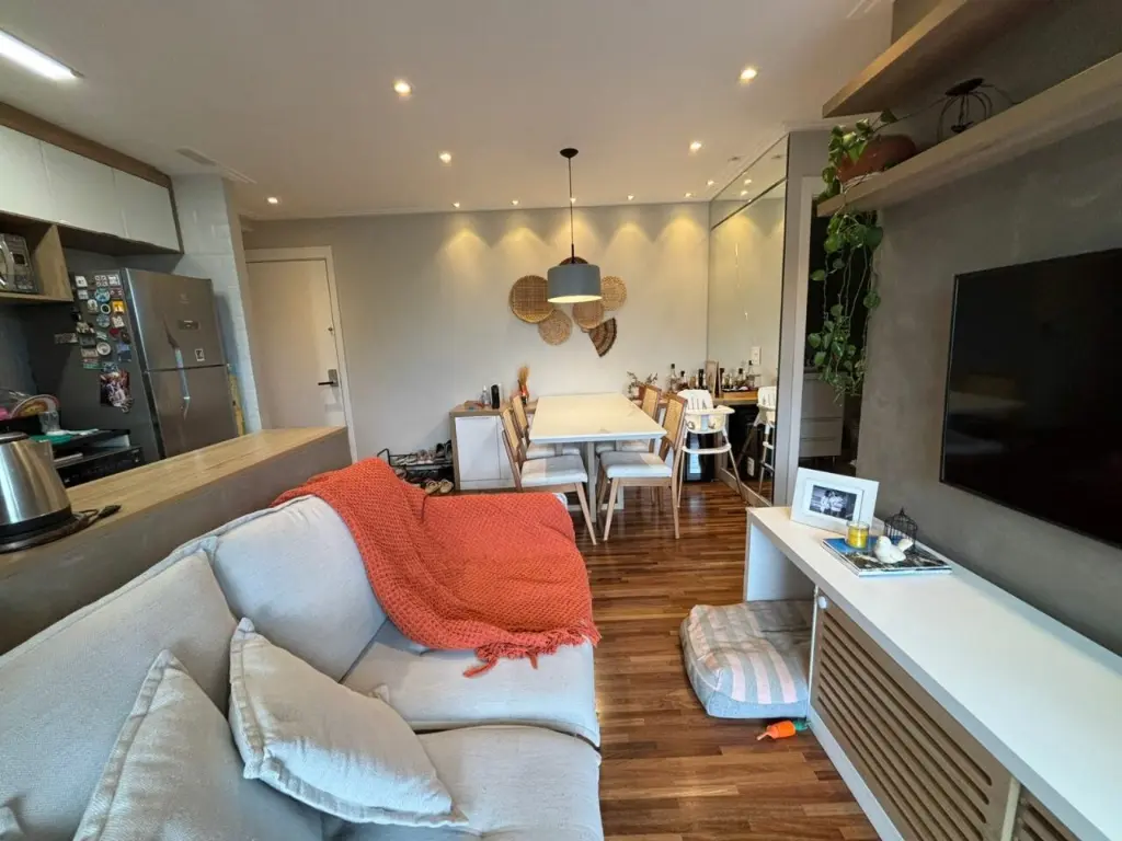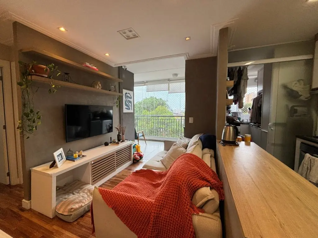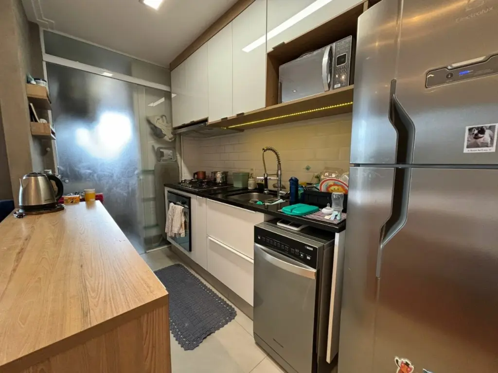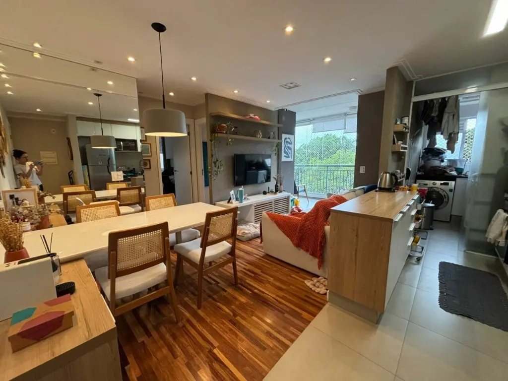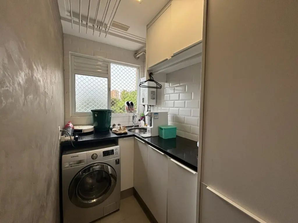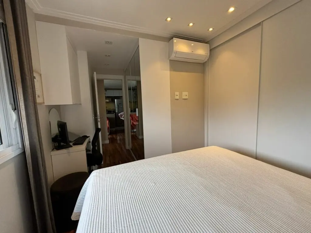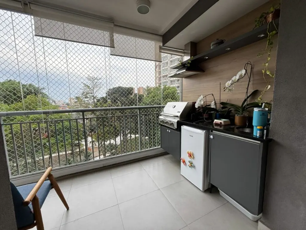 Apartamento com ar condicionado nos quartos, com 2 quartos com planejados. Banheiro social. Sala ampla integrada ao terraço gourmet, com churrasqueira elétrica e pia com fechamento de vidro. Cozinha com bancada, aberta, estilo americana com planejados, integrada a área de serviço. Possui o imóvel 1 vaga coberta.