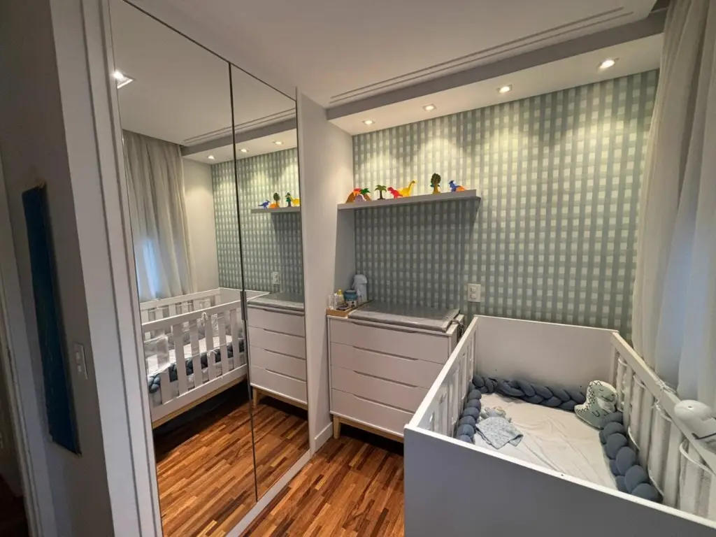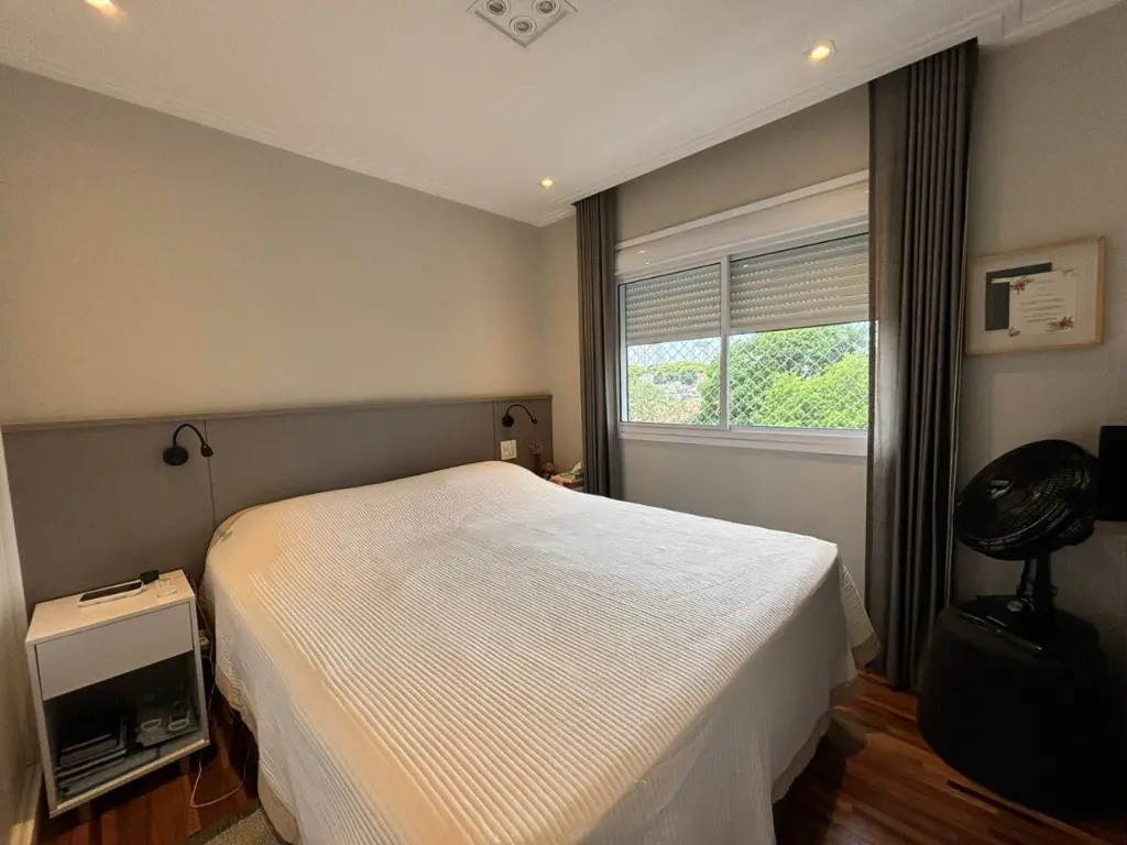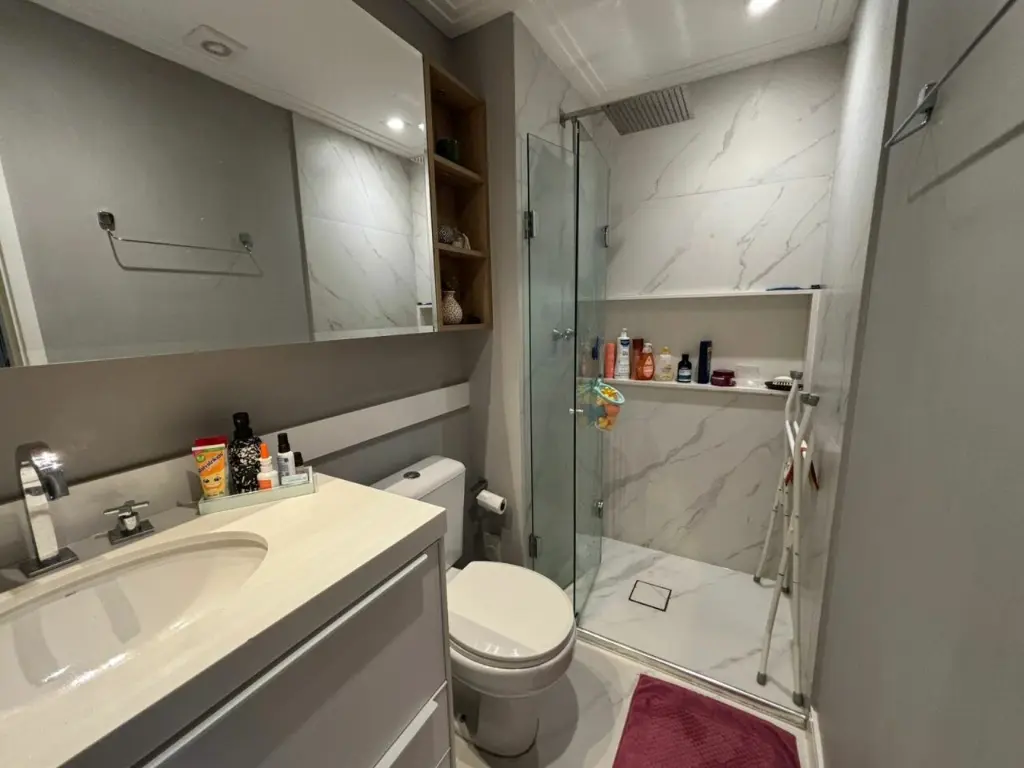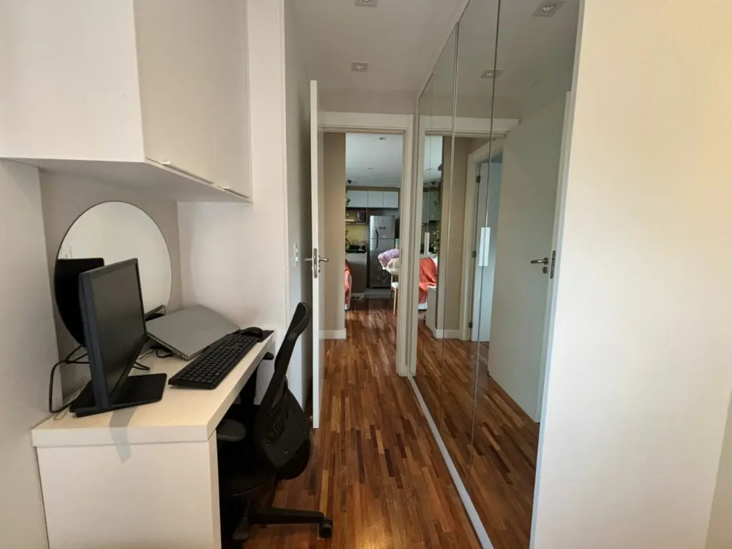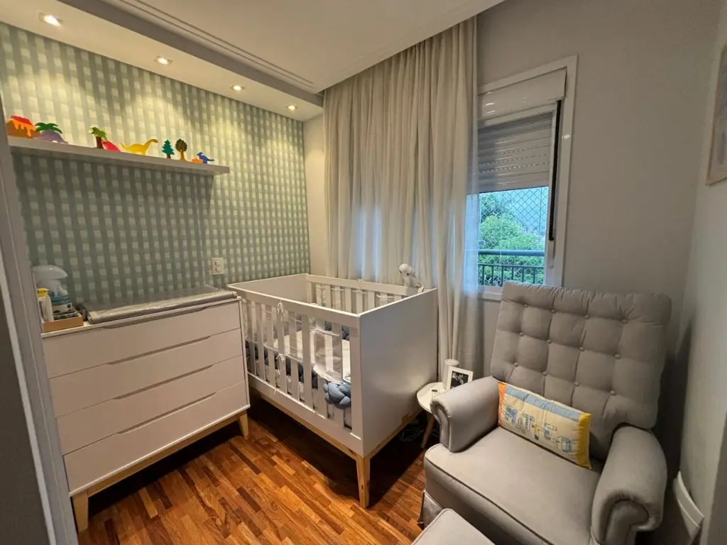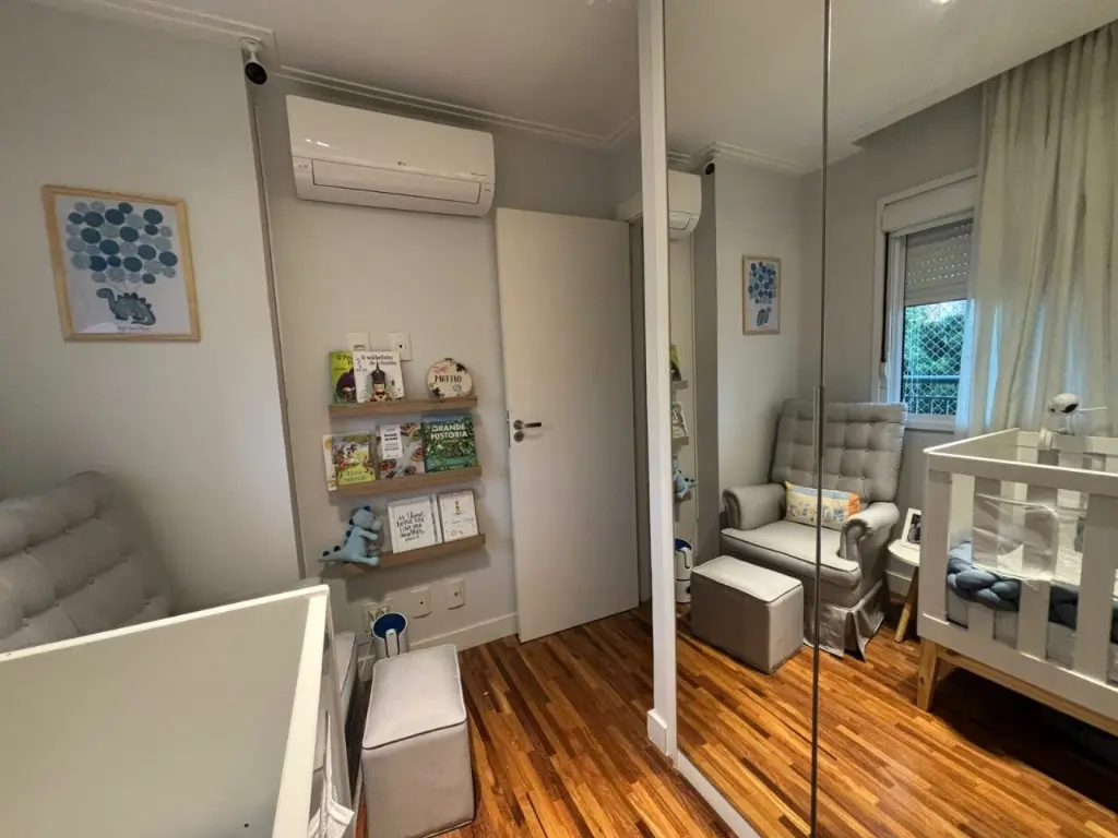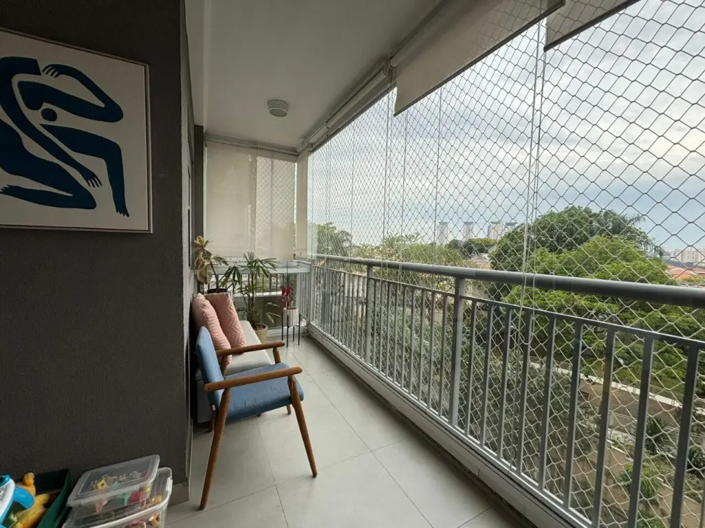 Apartamento com ar condicionado nos quartos, com 2 quartos com planejados. Banheiro social. Sala ampla integrada ao terraço gourmet, com churrasqueira elétrica e pia com fechamento de vidro. Cozinha com bancada, aberta, estilo americana com planejados, integrada a área de serviço. Possui o imóvel 1 vaga coberta.