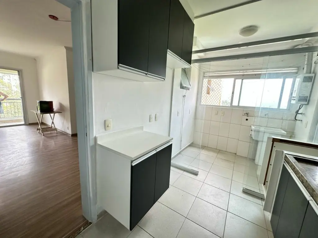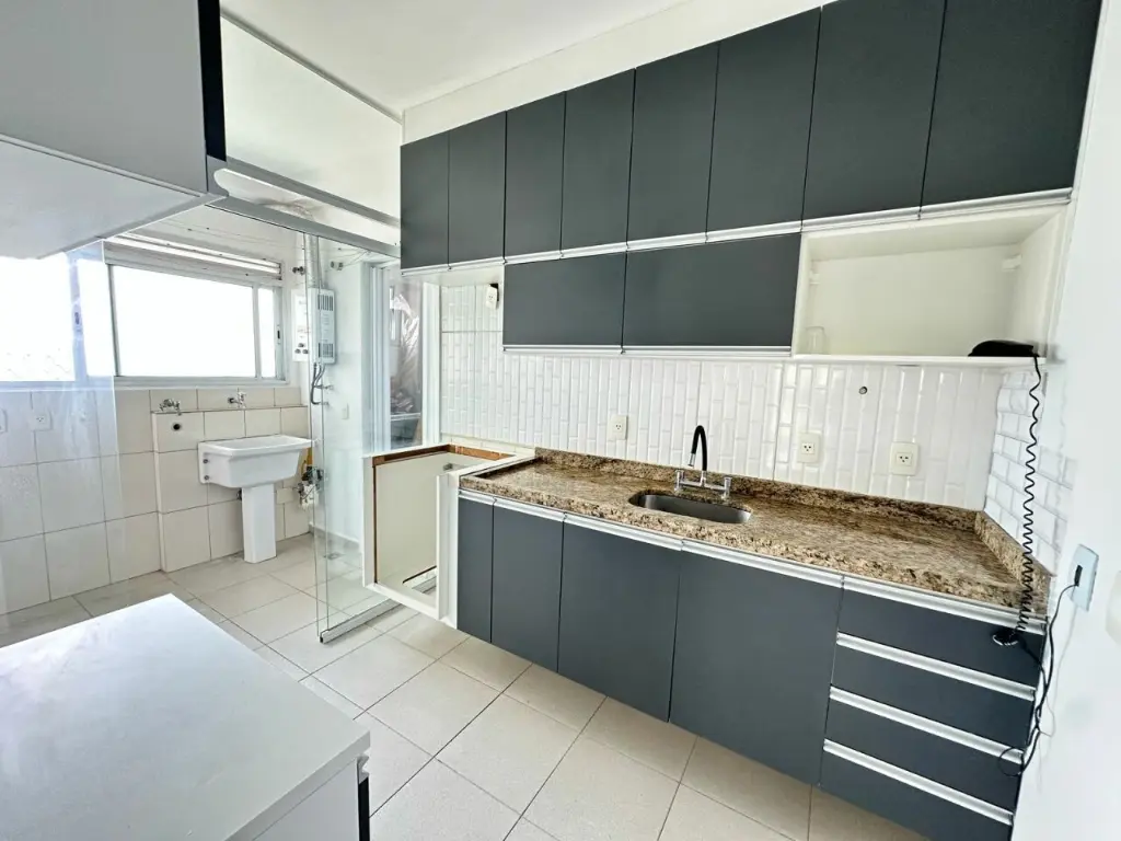 Cozinha com planejados, integrada a área de serviço e aquecimento a gas.