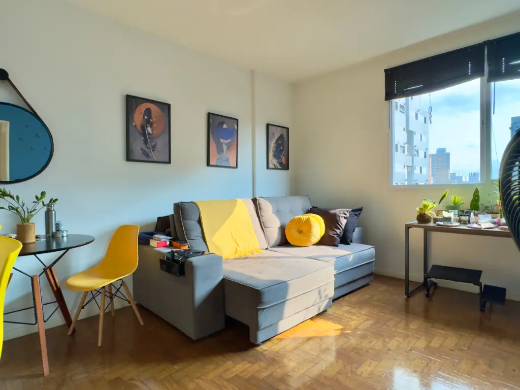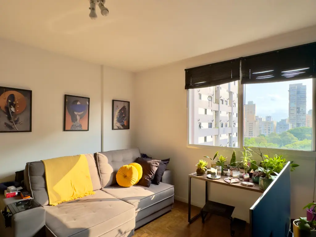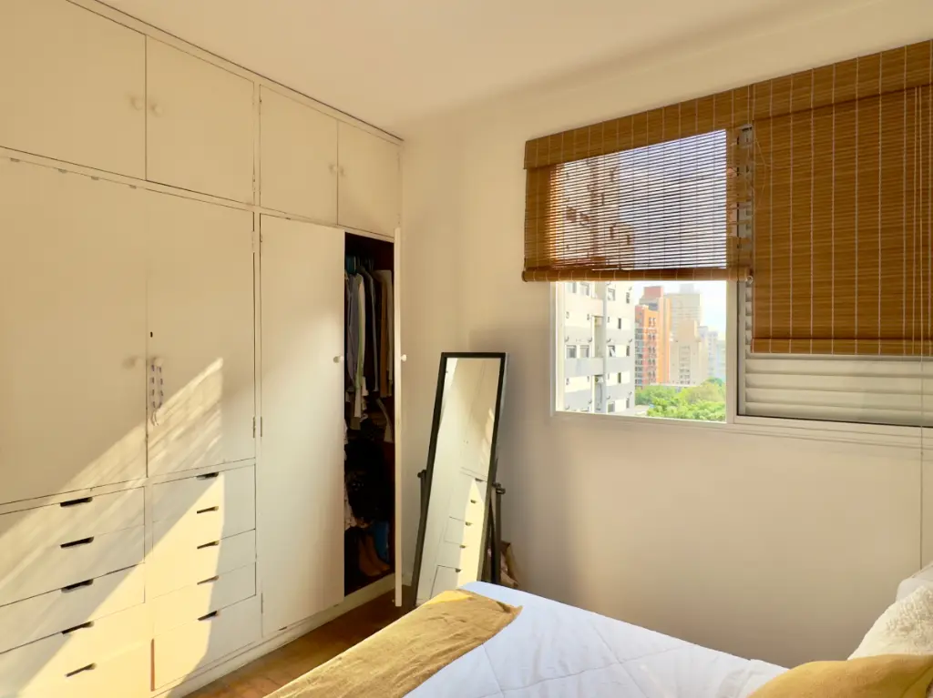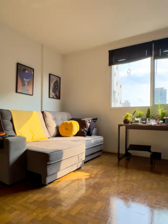 da janela é possível ver as árvores da Benedito e, à tarde, a luz do pôr do sol entra no apartamento de um jeito muito especial.