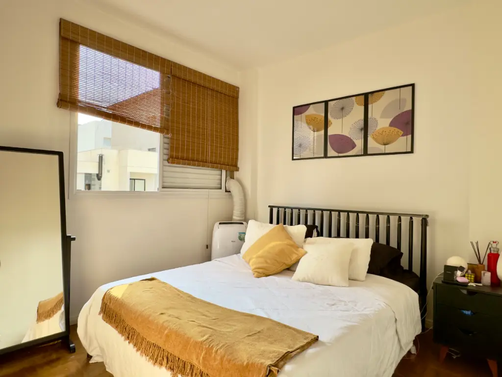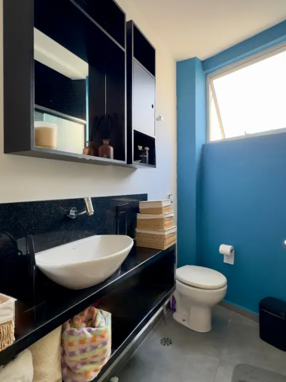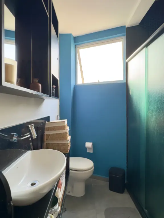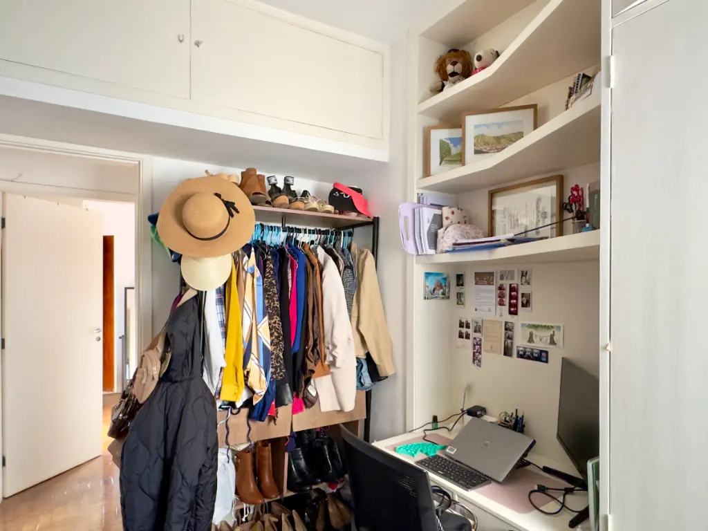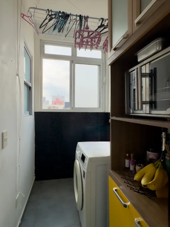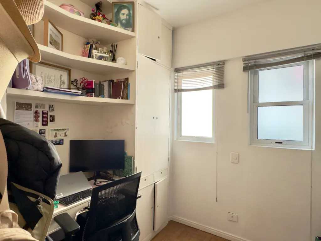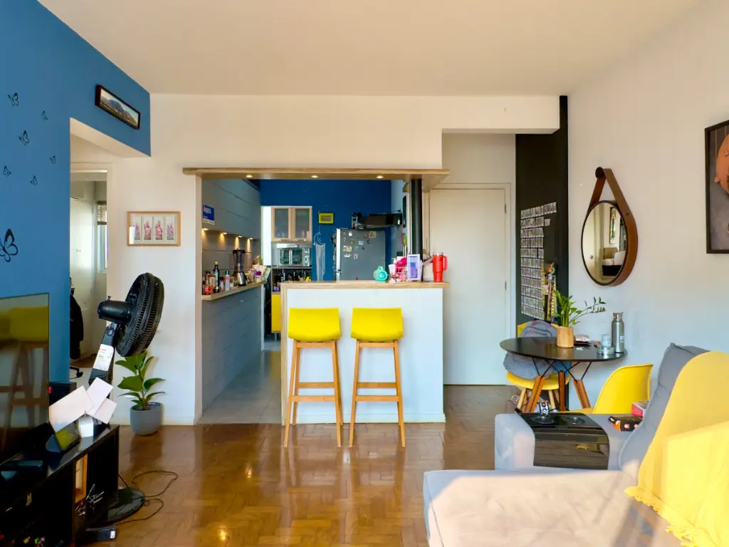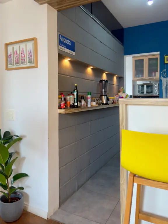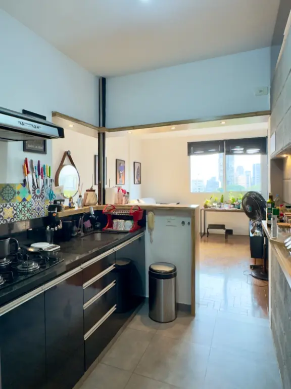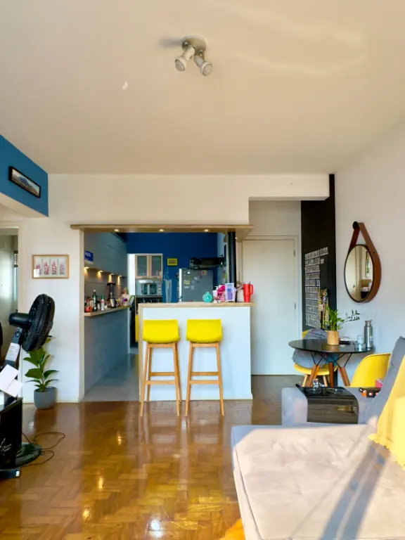 a cozinha se integra à sala por um balcão charmoso de madeira, o quarto auxiliar foi convertido em 2o quarto híbrido que hoje funciona como escritório e closet, banheiro social e um banheiro auxiliar na área de serviço, que aliás, é bem ventilada.