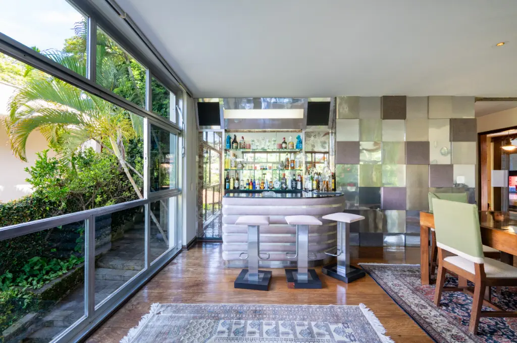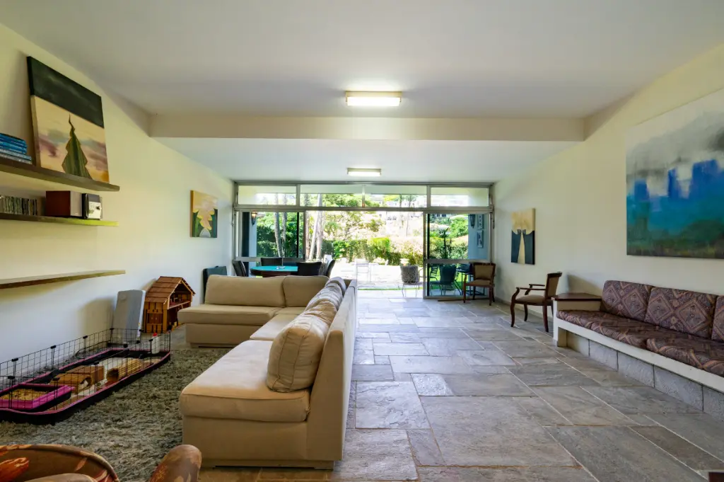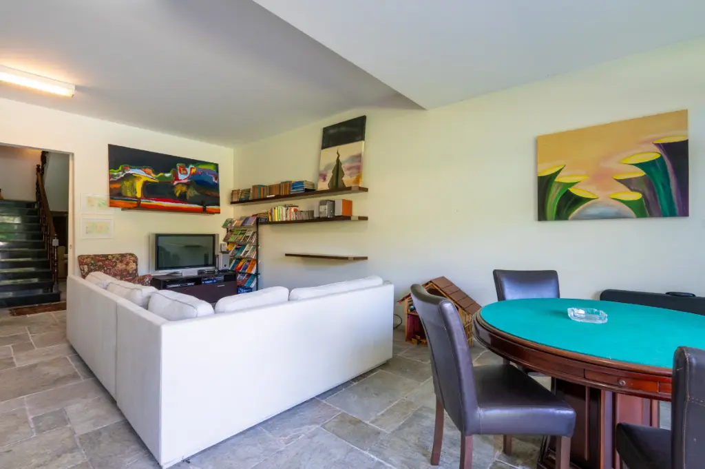 Na área social, a casa atinge seu auge: um salão de jogos de atmosfera acolhedora integra-se harmoniosamente a um estúdio de música, criando um cenário ideal para momentos de lazer, inspiração e convivialidade. Ambos se abrem para um jardim primoroso, onde a piscina - banhada pelo sol ao longo de todo o dia - configura um verdadeiro oásis particular.