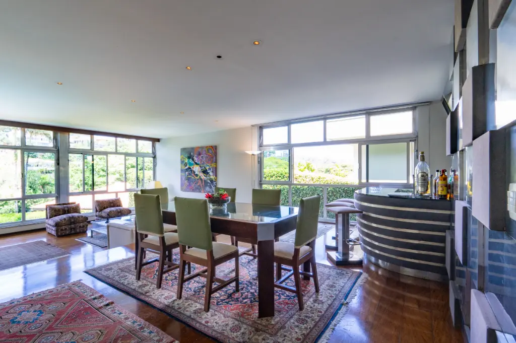 A luminosidade natural é protagonista, filtrada por generosas janelas do piso ao teto que ampliam a sensação de amplitude e revelam uma vista panorâmica de raro encanto. Elementos como água quente, área de serviço, dependência de funcionário, banheiro de serviço, closet e um acolhedor home theater reforçam o equilíbrio perfeito entre praticidade e refinamento.