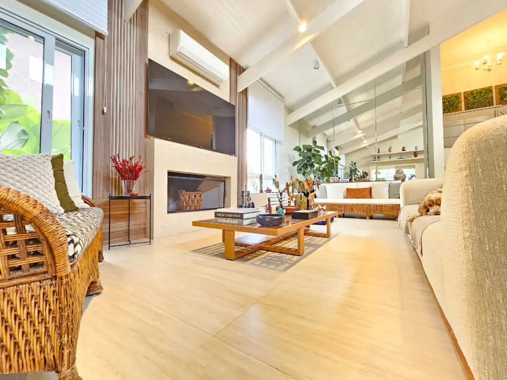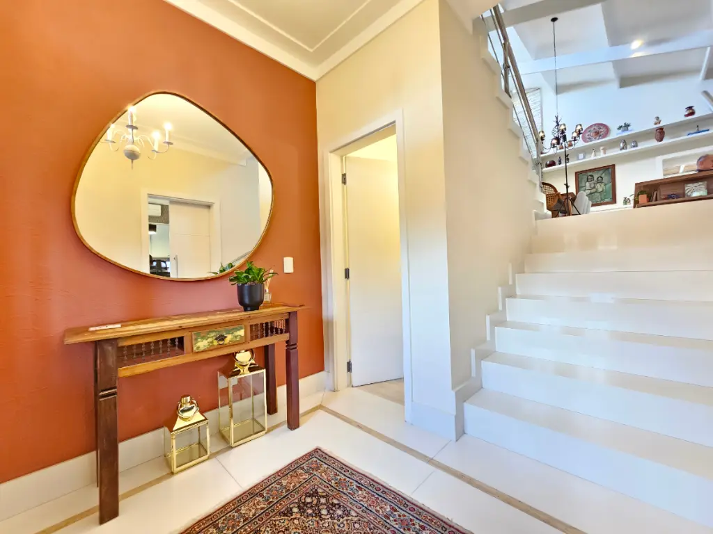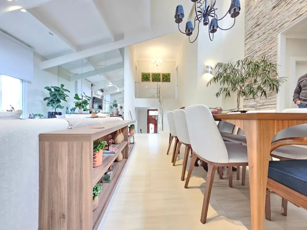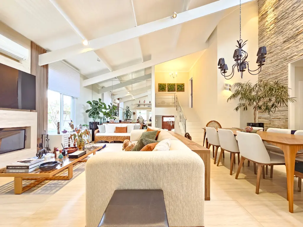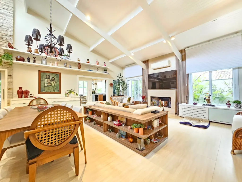 A casa oferece ainda ambientes amplos e bem distribuídos: sala de jantar, sala de estar com lareira e ar-condicionado, além de um escritório ideal para quem trabalha em home office. O lavabo atende às áreas sociais com sofisticação.