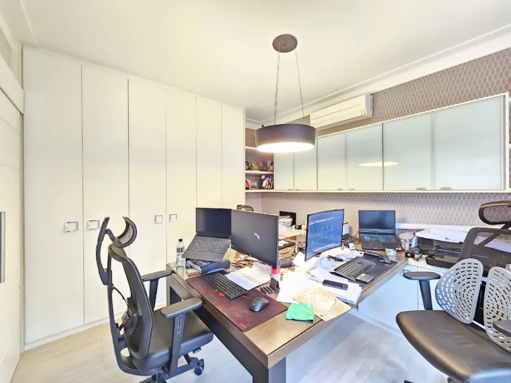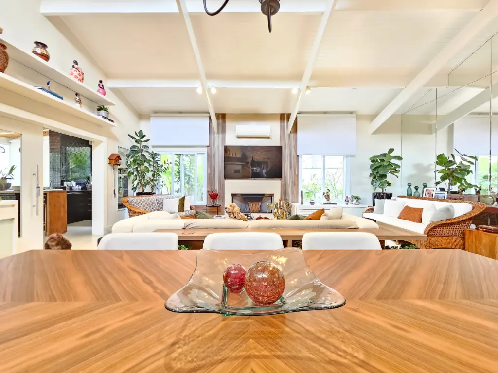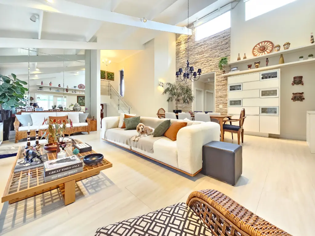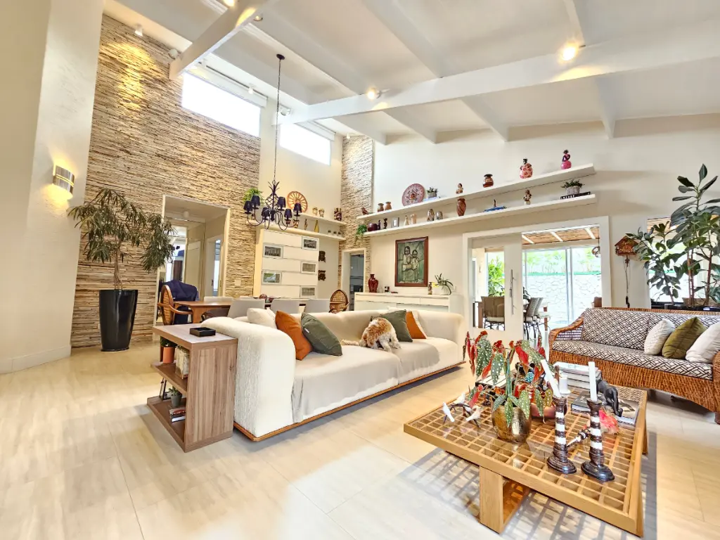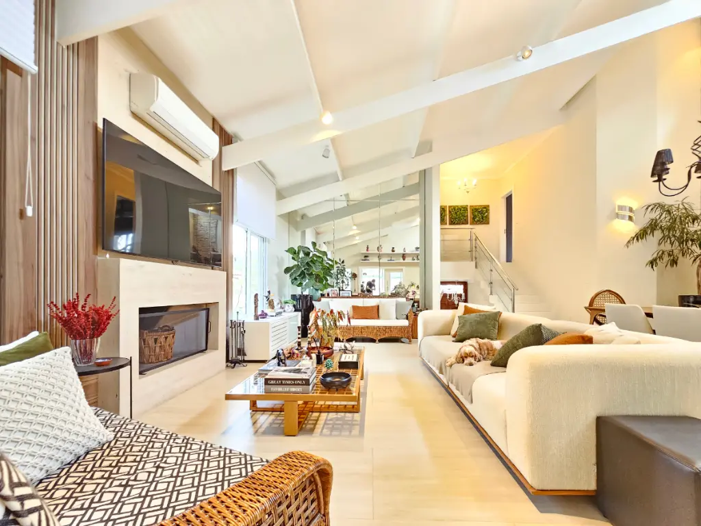 A casa oferece ainda ambientes amplos e bem distribuídos: sala de jantar, sala de estar com lareira e ar-condicionado, além de um escritório ideal para quem trabalha em home office. O lavabo atende às áreas sociais com sofisticação.