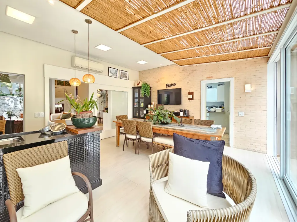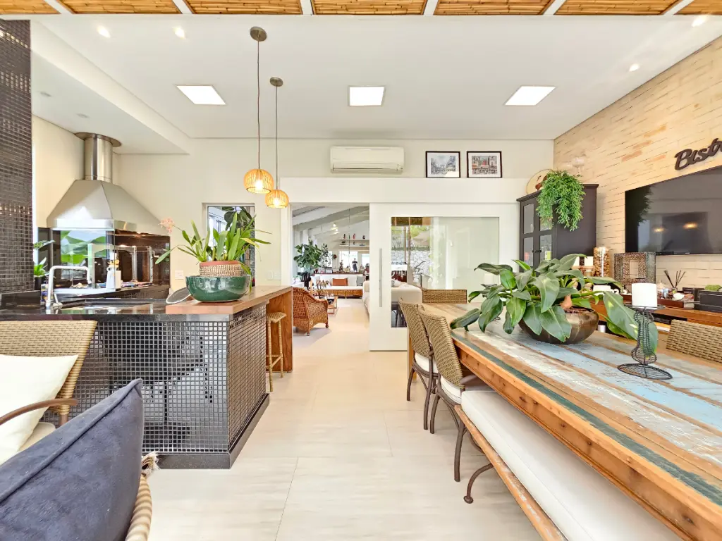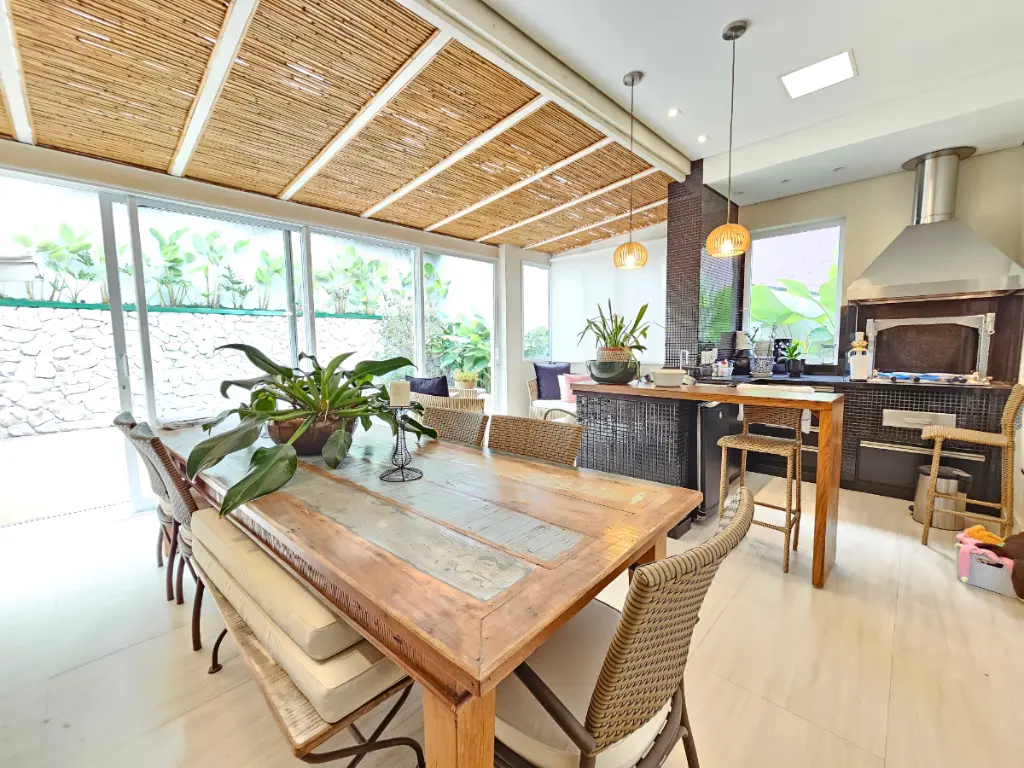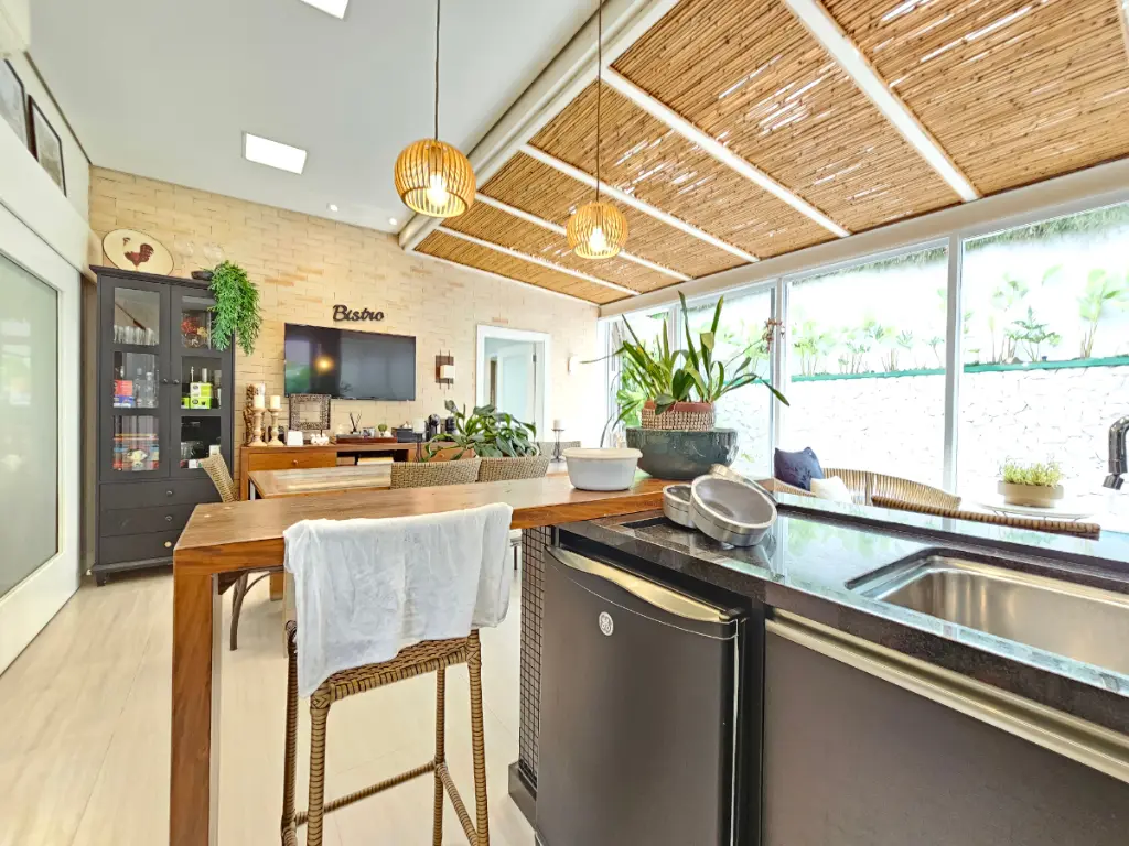 A área gourmet é um dos grandes diferenciais da casa: equipada com churrasqueira e totalmente integrada com a sala e a piscina, cria um ambiente perfeito para receber amigos e familiares. Conta ainda com um banheiro externo de apoio à área da piscina.